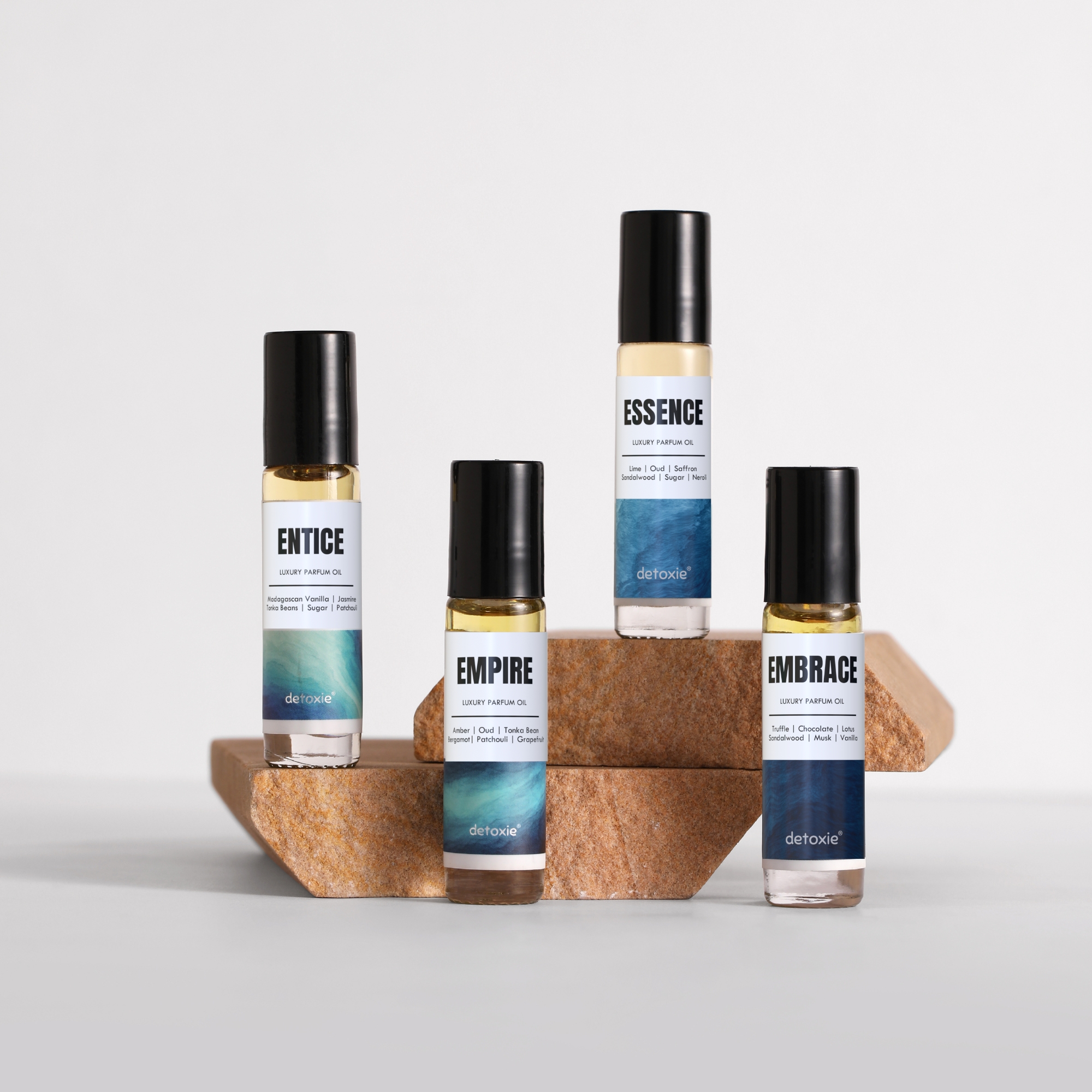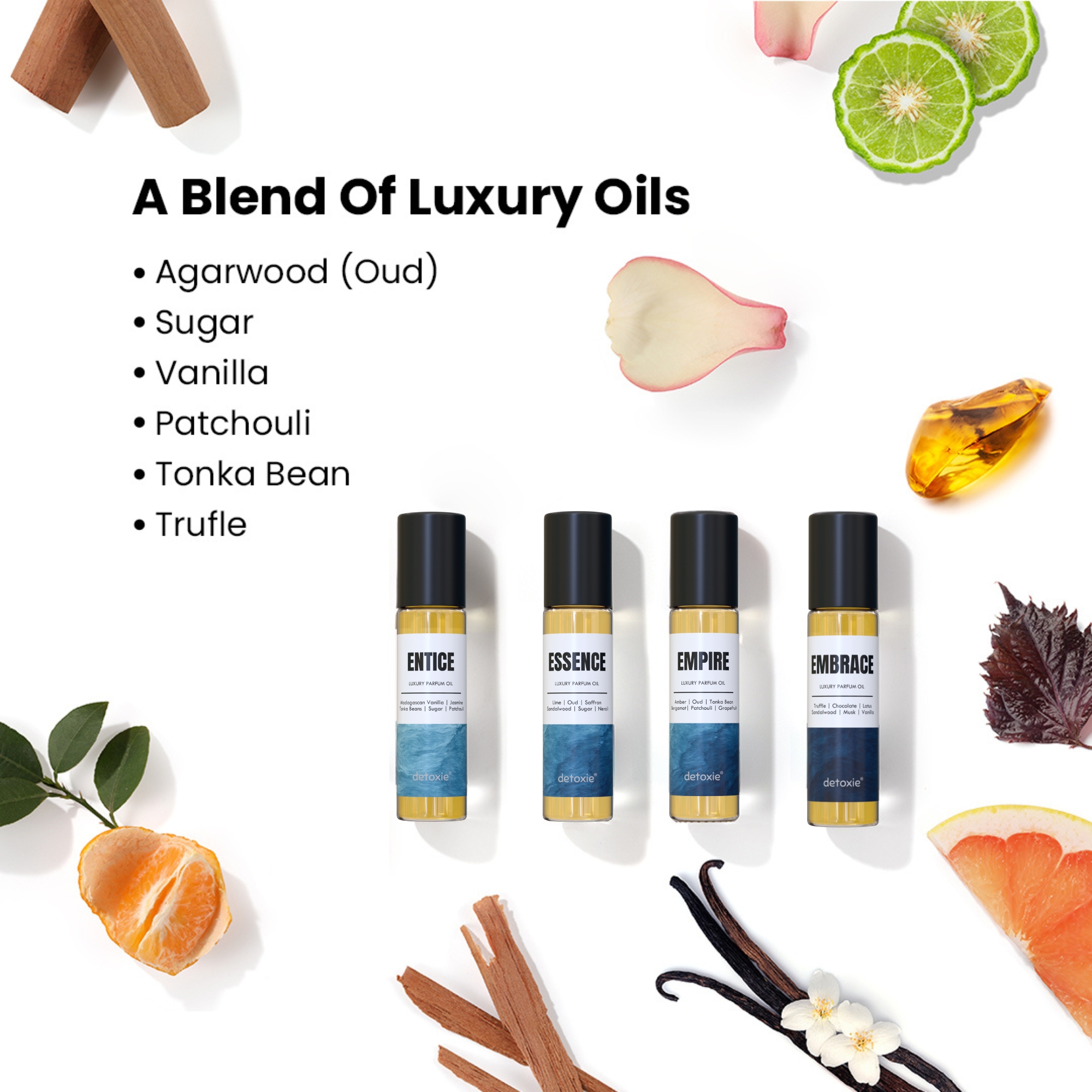 Experience pure luxury with our Limited Edition Attar Gift Set, featuring four luxury parfum oils crafted to perfection. Entice captivates with a warm, sensual blend of Madagascan Vanilla, Jasmine, Tonka Beans, Sugar, and Patchouli. Essence offers a refreshing yet opulent fusion of Lime, Oud, Saffron, Sandalwood, Sugar, and Neroli for a bright, refined trail. Embrace wraps you in a rich, comforting aroma of Truffle, Chocolate, Lotus, Sandalwood, Musk, and Vanilla, creating a soft gourmet aura. Completing the collection, Empire delivers a bold, regal statement with its striking mix of Amber, Oud, Tonka Bean, Bergamot, Patchouli, and Grapefruit. Together, these four exceptional oils create a symphony of scents perfect for gifting or elevating your personal fragrance ritual.