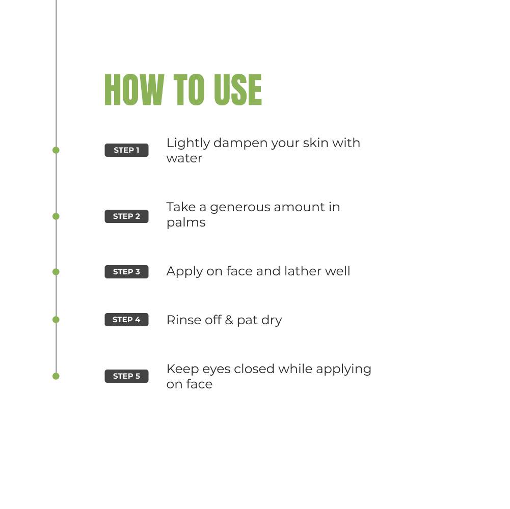 Apply a small amount of this face wash to wet skin, gently massaging in circular motions to create a light lather. Rinse thoroughly with lukewarm water and pat dry. Use twice daily for clean, refreshed skin. Suitable for all skin types, but perform a patch test for sensitive skin. Store in a cool, dry place, tightly sealed, to maintain freshness. Avoid eye contact.