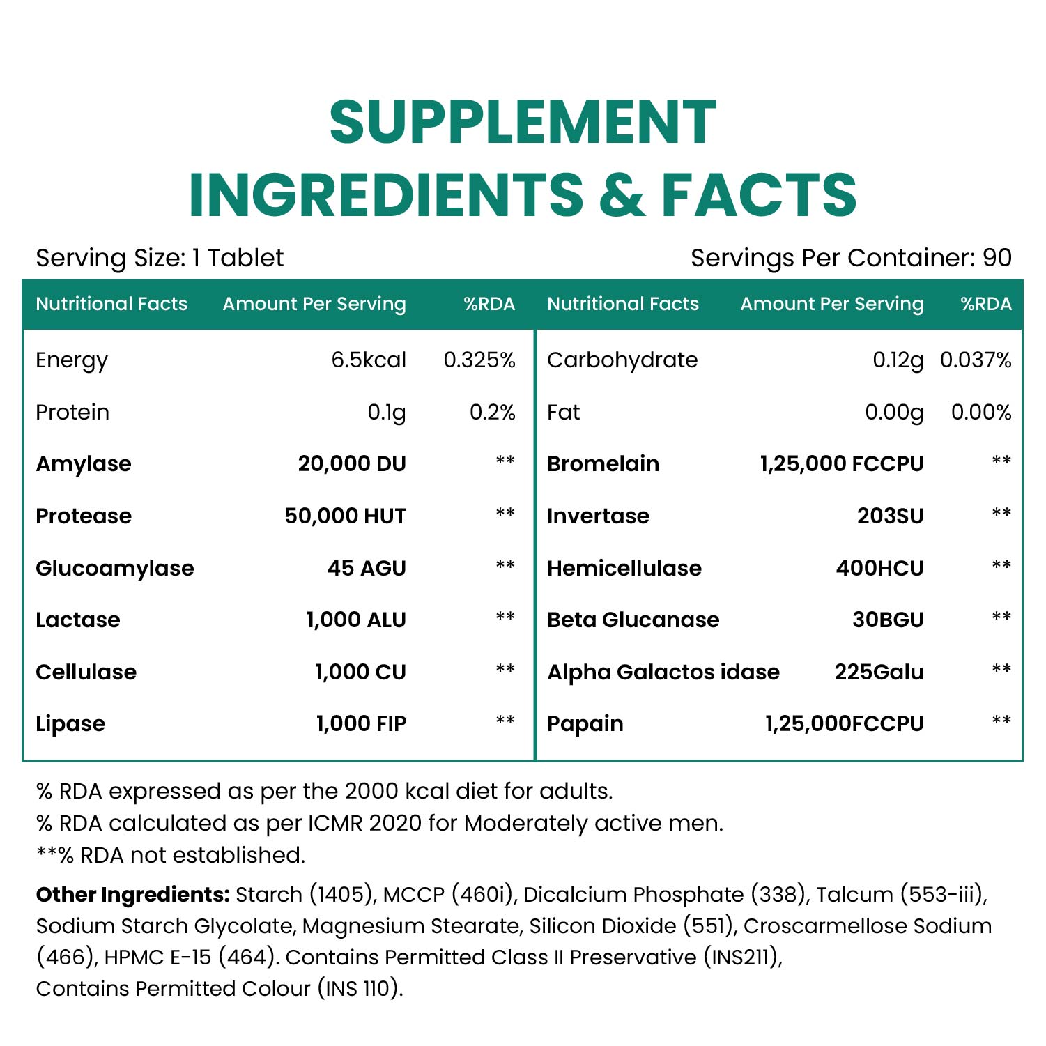 Amylase, Protease, Glucoamylase, Lactase, Cellulase, Lipase, Bromelain, Invertase, Hemicellulase, Beta Glucanase, Alpha Galactosidase & Papain.