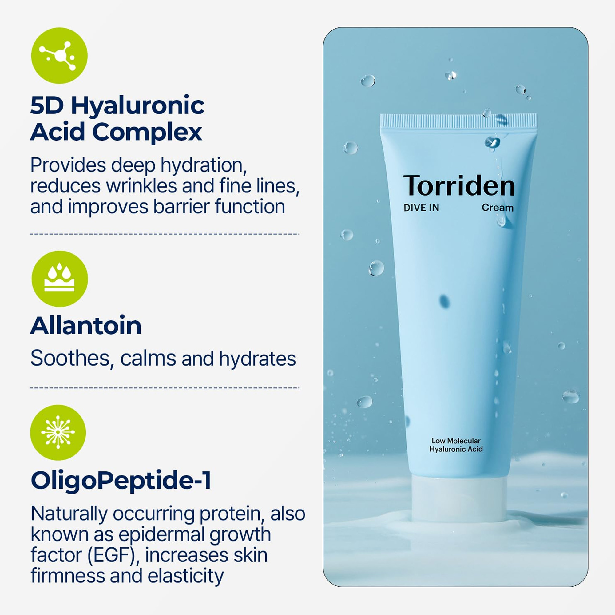 The Torriden Dive In Cream is an award-winning soothing cream formulated with 5D-Complex Hyaluronic Acid to offer deep hydration and a skin-revitalizing effect. 5D Complex Low Molecular Weight Hyaluronic Acid hydrates the skin, helping to alleviate internal tightness with this high-moisture cream.The unique Water Ball Holding System locks in moisture by wrapping around the moisturizing ingredient like a net to help the formula get absorbed freshly into skin and keep skin moisturized for a long time.