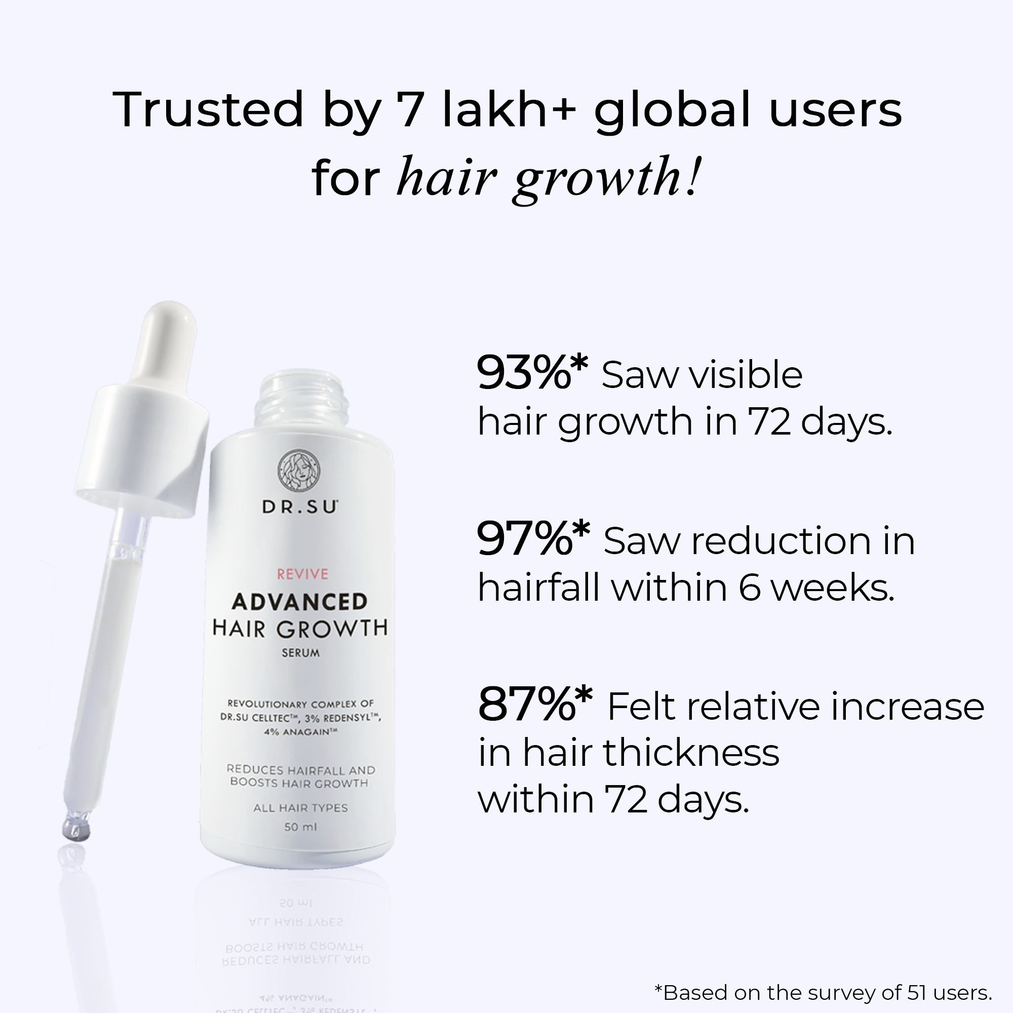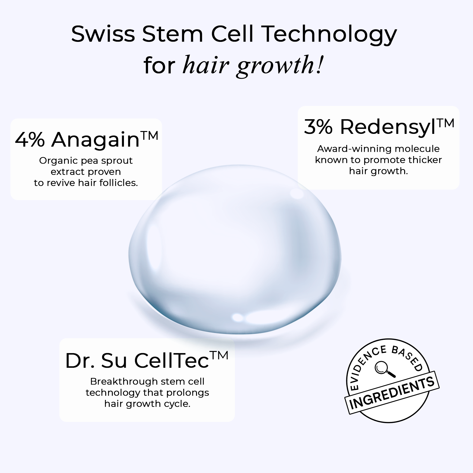 Discover the new and limited edition Dr. Su Advanced hair growth serum, backed by swiss nano technology which reduces hairfall and boosts hair growth. This world-first formula is formulated by an award winning dermatologist with their very own proprietary stem cell complex - Dr. Su CellTecTM and patented molecules AnaGainTM, and RedensylTM. This serum is clinically proven to enhance visible hair growth, relative increase in hair thickness and density. Its lightweight, fast-absorbing and non-sticky nature makes application a joy!