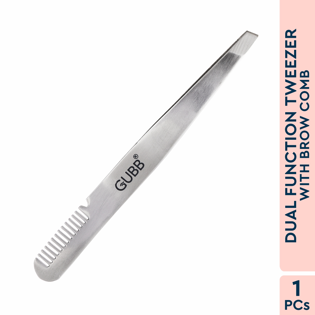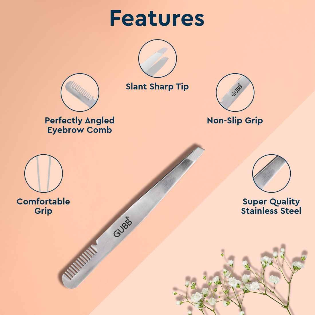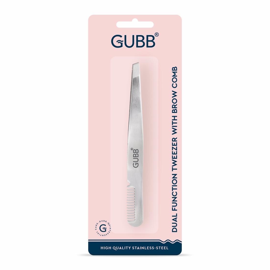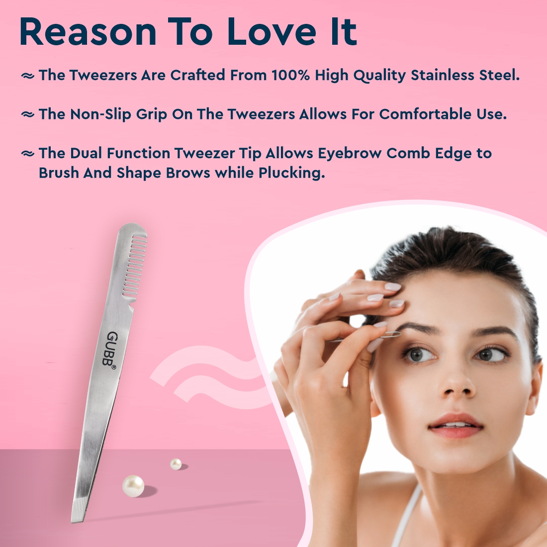 The GUBB stainless steel tweezers are designed with a slant tip to pluck the smallest of hairs and a comb on the end to brush through the brows for effective tweezing. Pluck stray strands of hair and peach fuzz right from the root, and use the tweezer to precisely define your eyebrows.