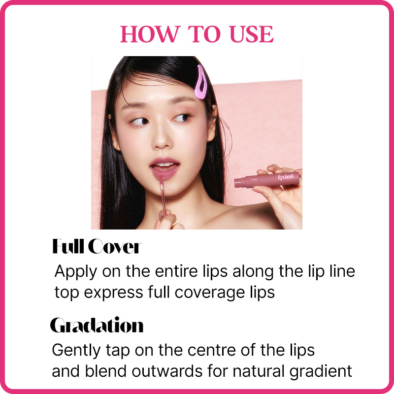 Apply on the entire lips along the lip line or on the center of the lips in a tapping motion to express gradation.