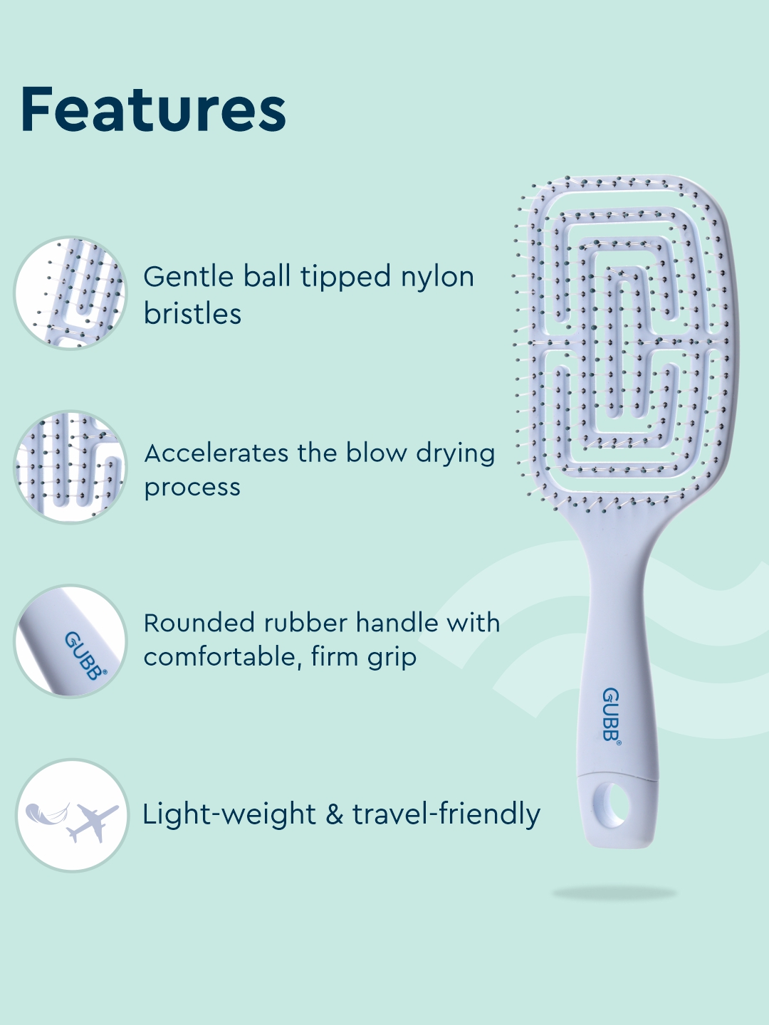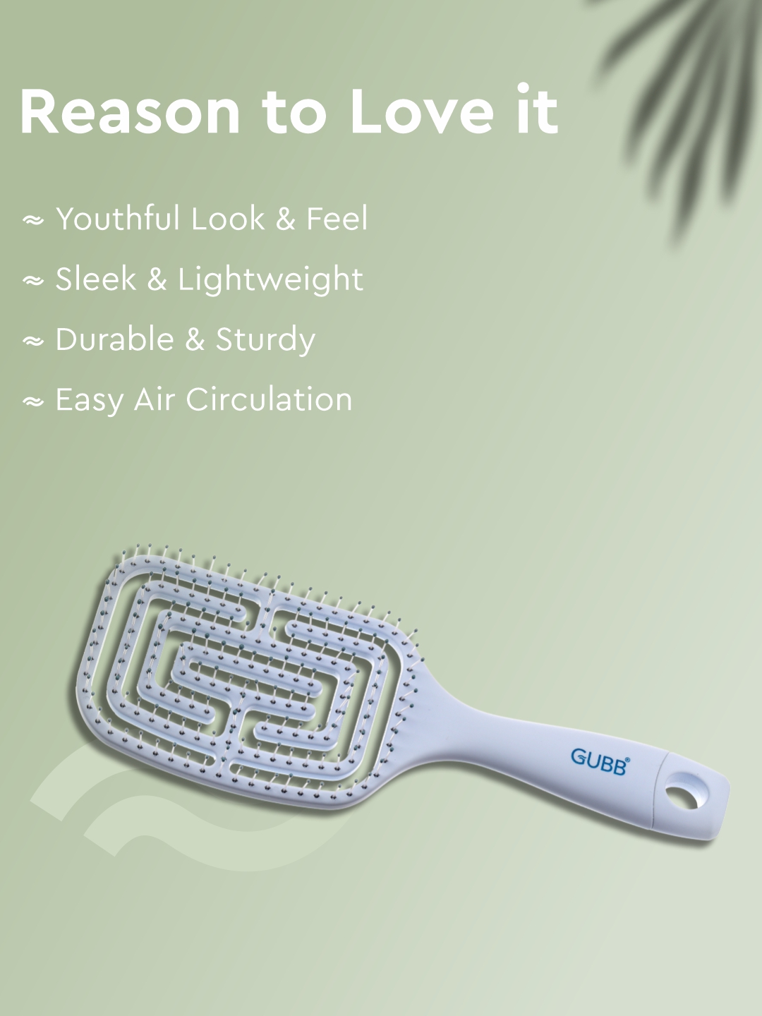Our smartly designed brush ensures smooth and silky hair every time, making it easy to style your hair the way you like. Soft, flexible pins gently style & shape your hair, while rounded ends protects your hair & scalp from damage. Must have for every girl who loves her hair! Pair the GUBB vent hair brush with your favourite hair appliances for speedier blowouts! This vented paddle is designed to support airflow while flexible, durable bristles wisely remove tangles and smooth your hair as it dries. The Flexi Vent brush has a soft-touch surface which offers the ideal grip for your hand and the rounded cool-tips allow for close contact with hair's roots without burning the scalp to enable for greatest lift and smooth snag-free styling.