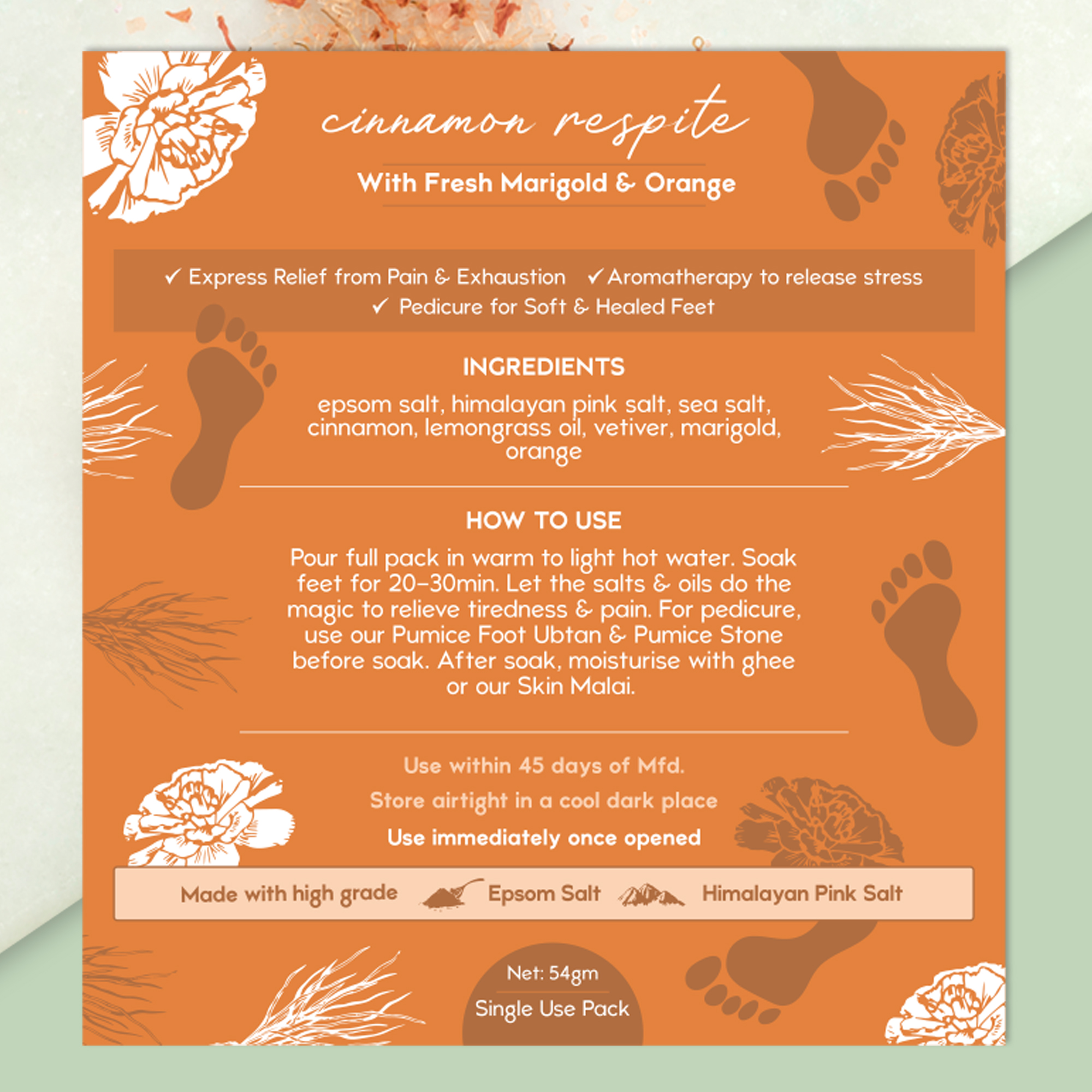 Super relaxing & rejuvenating Foot Salt with aromatherapy. A must-have for exhausted, tired feet and legs. Packed with therapeutic grade epsom salt & himalayan pink salt, it provides express relief from pain, inflammation & exhaustion. And the oils, orange, cinnamon & marigold in the pack, help detox, nourish & moisturise. A 20min hot salt soak will give you true respite from a tough day!