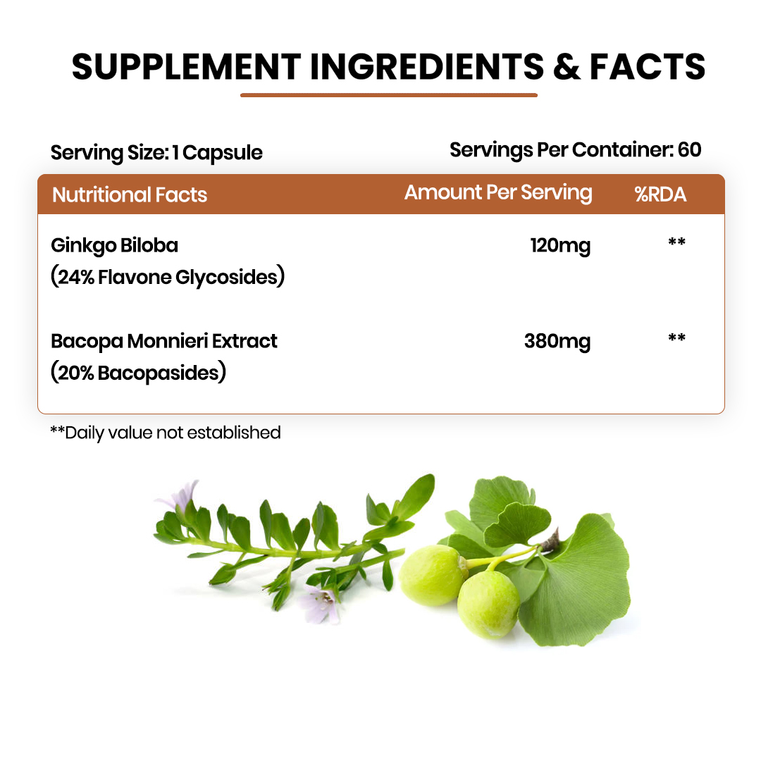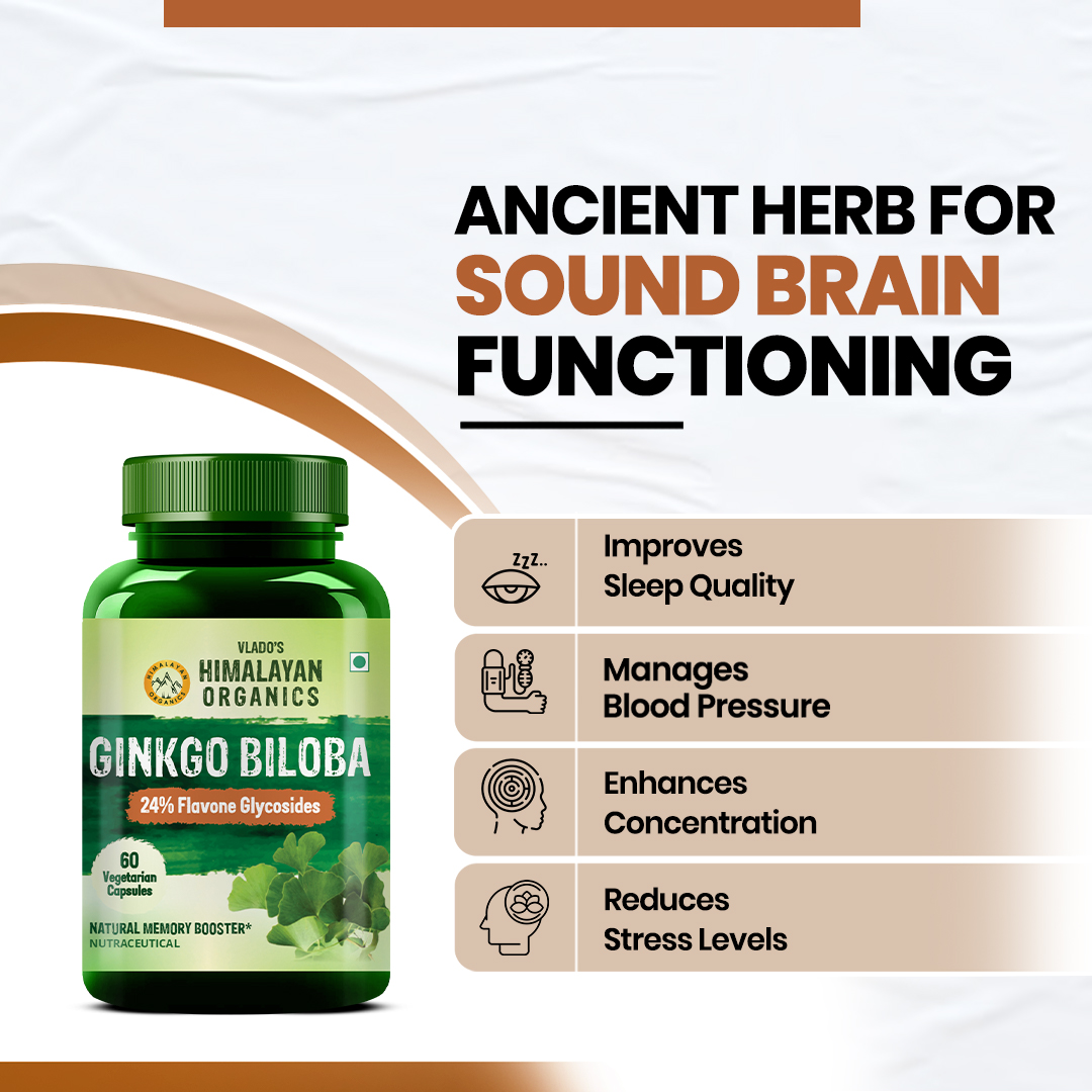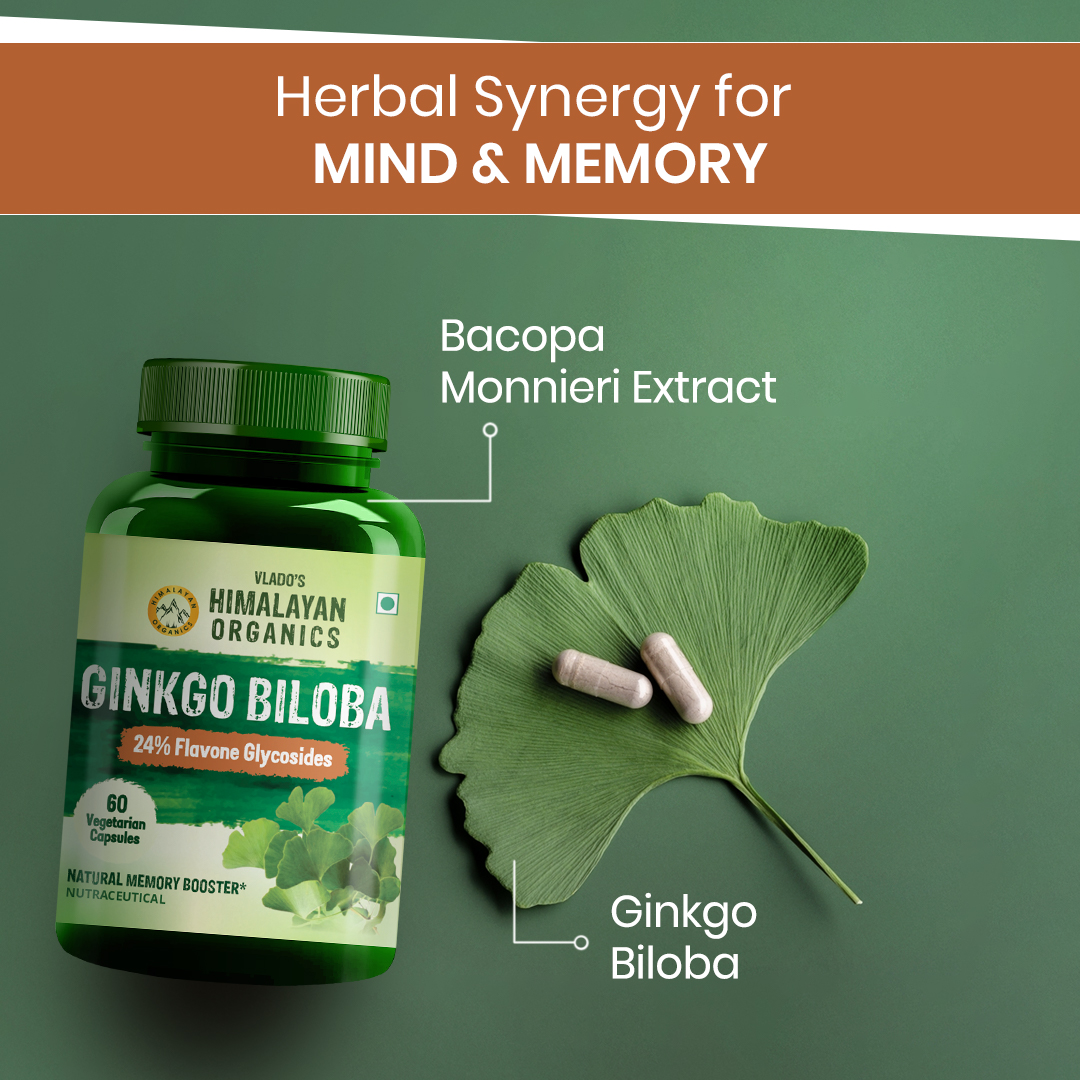Enhance memory, improve concentration, regulate anxiety, enjoy sound sleep, and maintain healthy red blood cells with Himalayan Organics Ginkgo Biloba Capsules. The goodness of Ginkgo and Bacopa Monnieri Extract (Brahmi) is packed in 60 vegan and gluten-free capsules for your memory, focus, and concentration. Ginkgo Biloba has been used for its medicinal properties as it helps in efficient brain functioning and blood circulation. It also contains potent antioxidants that neutralize free radicals and manage inflammation caused by various conditions. Adding this to your daily diet routine may help promote healthy blood flow to the brain and body, thus helping in better memory, focus, and concentration. Level up your cognitive functioning with the power of 2 potent and highly active ancient herbs!
