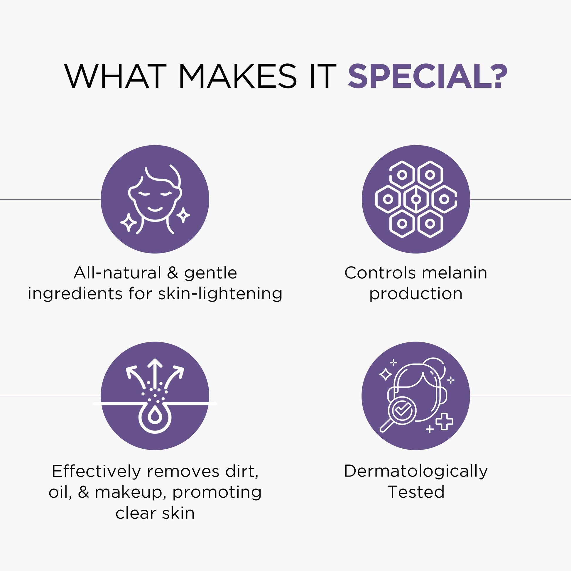 Glopure Facewash is made with skin-lightening ingredients, which nourish and revitalize the complexion to make skin look white fresh, soft, and beautiful. It deep cleanses the skin and lightens skin tone. It is best suited to remove dirt, oil, and makeup from the face. It is made with Mulberry, Liquorice, and Aloe Vera extract.