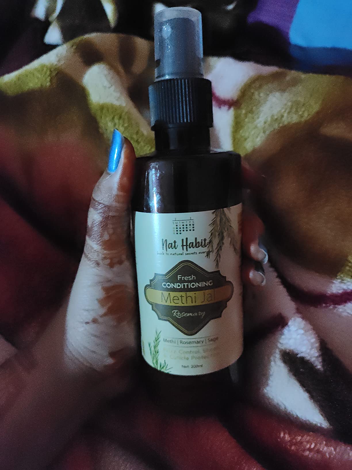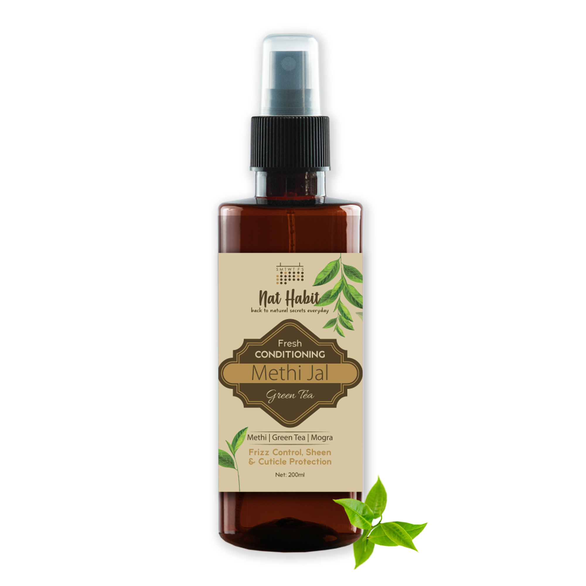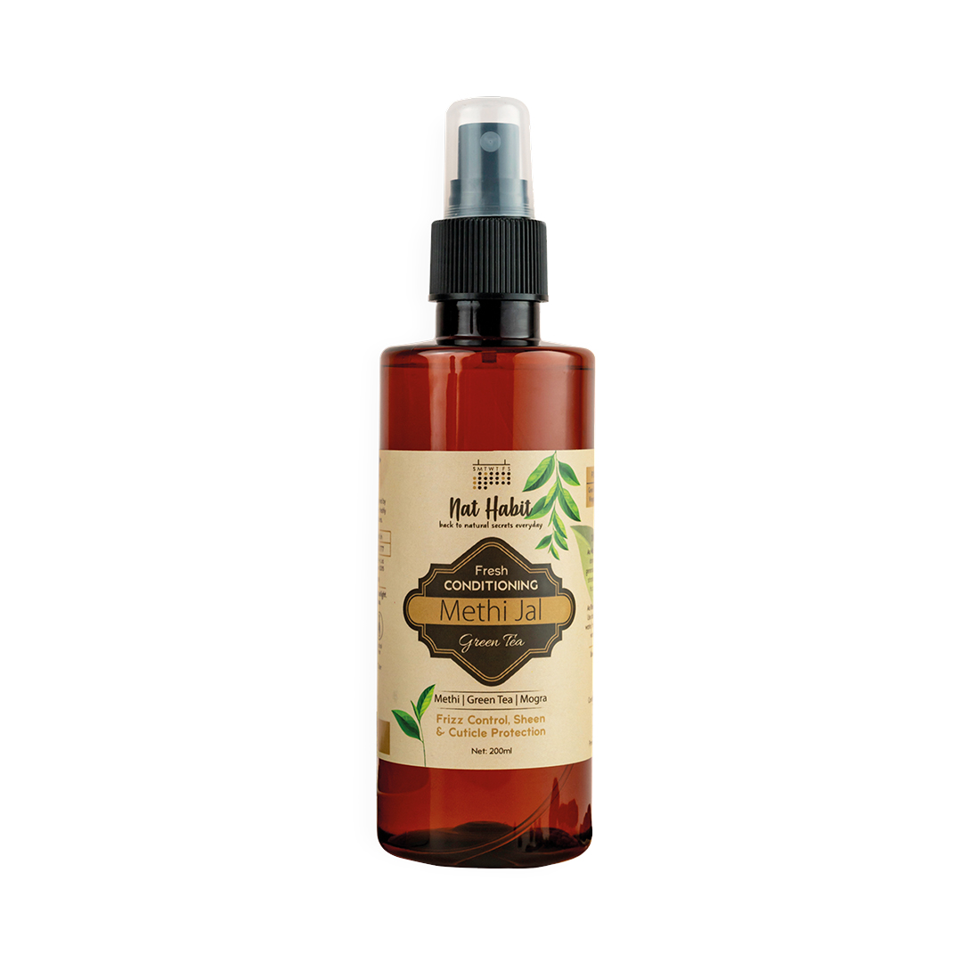 Kitchen fresh Nat Habit Green Tea Conditioning Methi Jal prepared with deep soak and steam distillation of herbs and flowers. This conditioning Ayurvedic hair mist is prepared with methi (fenugreek), green tea, mogra, mulethi, shikakai and patchouli that moisturise hair shaft and protect cuticles from opening and getting damaged. It also has pure apple cider vinegar that strengthens the strands and gives a nourished sheen to the mane. It contains no alcohol, no glycerin, no chemicals and no preservatives. Only pure hair care!