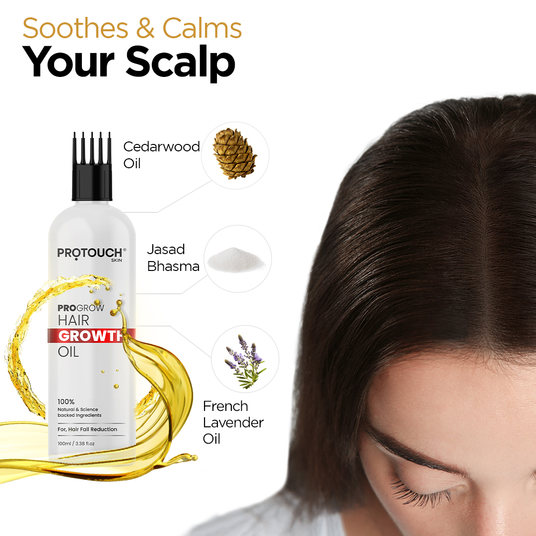 Protouch Pro-Grow Hair Growth Oil is a unique blend of 21 unique cold pressed herbal oils & actives like Rosemary oil, Kalonji Ext., Tea Tree oil, Amala, Bhringaraj, Neem, Methi, Jasad Bhasma and many more. This is a 100% Natural solution designed specially for multiple hair problems like Hair Fall, Greying, Thinning & Dryness for all hair types. It deeply nourishes & rejuvenates hair, soothes and calms the scalp, that promotes healthier, fuller hair growth while reducing hair fall. It also provides effective protection against dandruff & early hair greying.