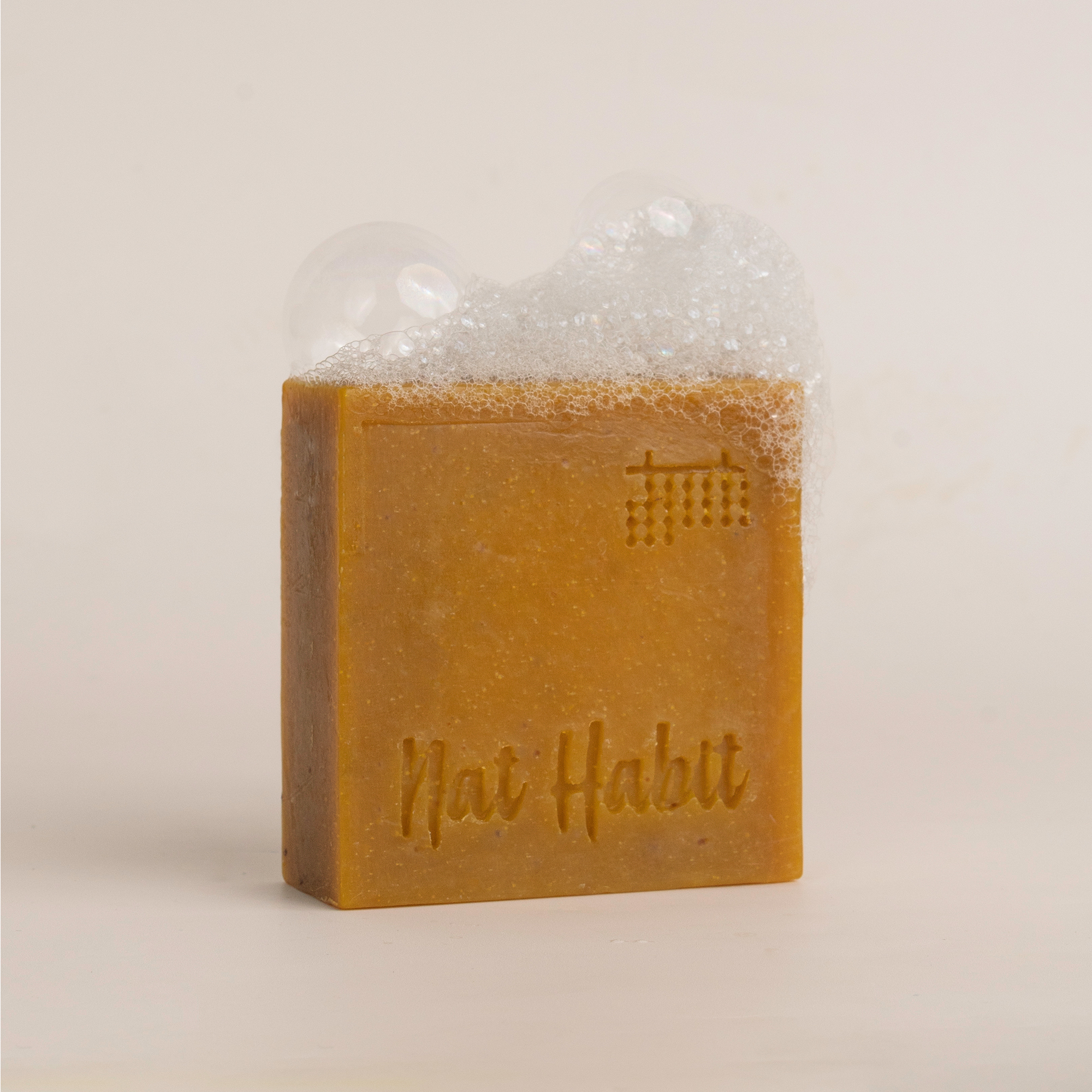 Nat Habit Healing Turmeric Oats Handmade Butter Bath Soap is made using a natural and cold processed method. Suitable for men and women, this soap is made of pure oils, kokum butter, turmeric, honey, oats, cedarwood, vanilla and black amber. The non-drying,soft cleansing soap protects the skin's natural oils. It targets skin problems like spots, blemishes, pigmentation and sun tan. The soap helps your skin to glow with clarity and radiance, it clears flakiness, dryness and itchy skin.