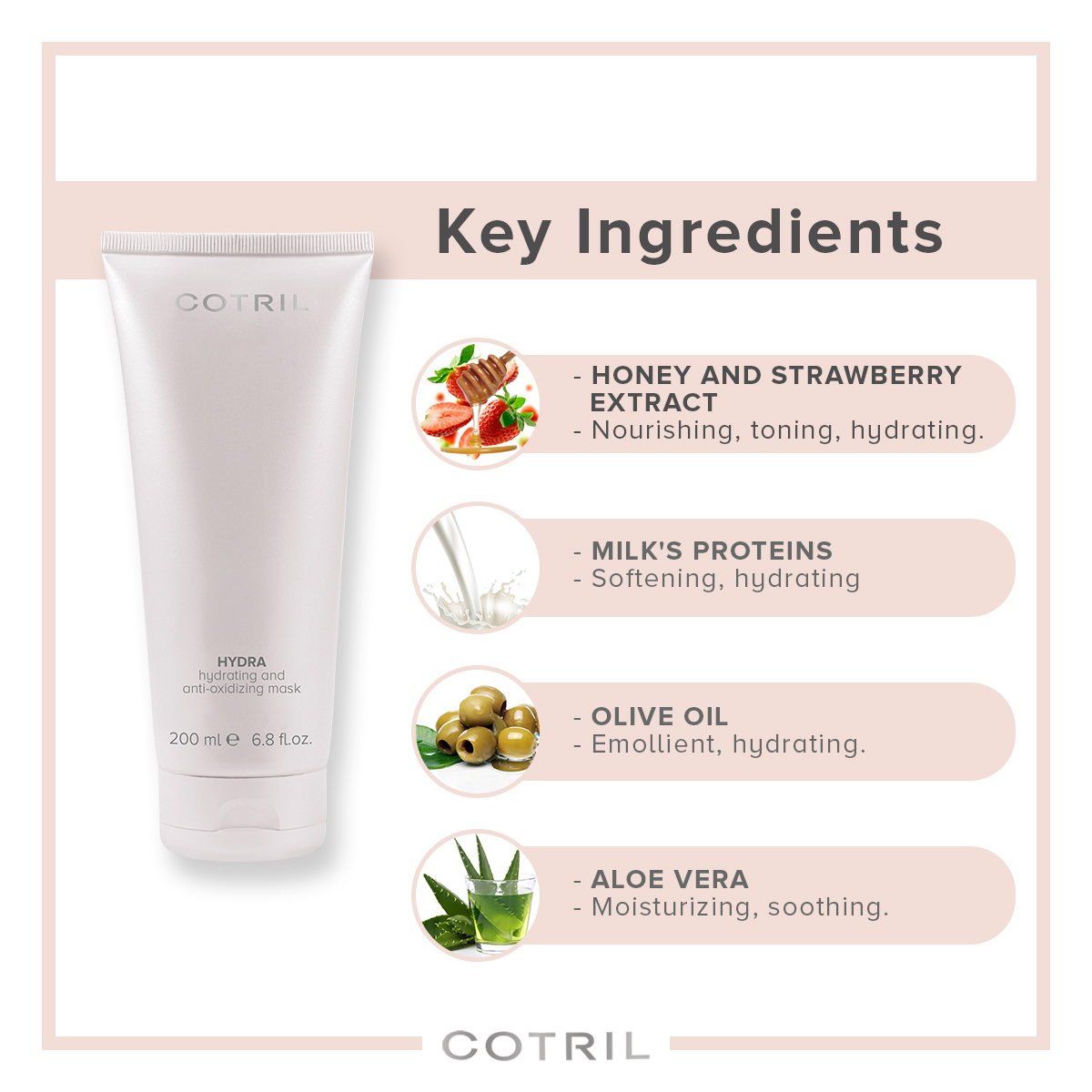 Honey And Strawberry Extract, Milk Proteins, Olive Oil, Aloe Vera, Pomegranate Extract, Vitamin E