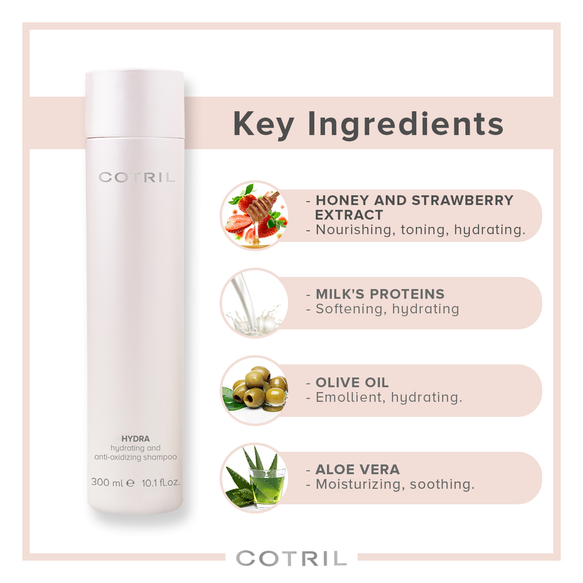Honey And Strawberry Extract, Milk Proteins, Olive Oil, Aloe Vera, Pomegranate Extract, Vitamin E
