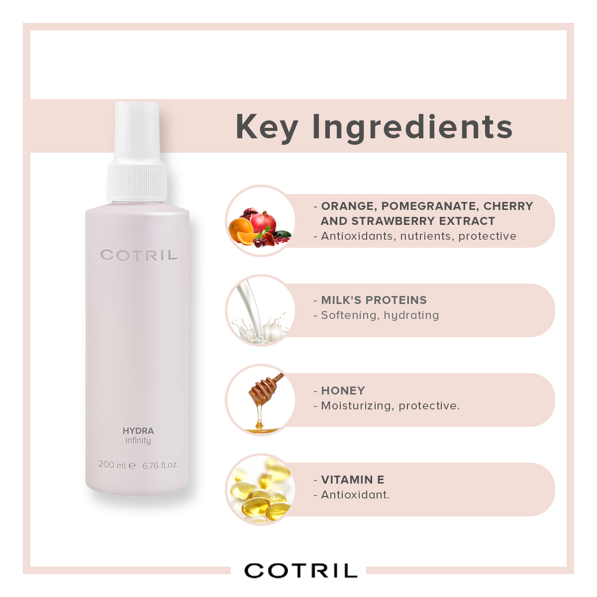 Honey Extract, Milk Proteins, Orange, Pommegrenade, Cherry And Strawberry Extract, Pomegranate Extract, Vitamin E
