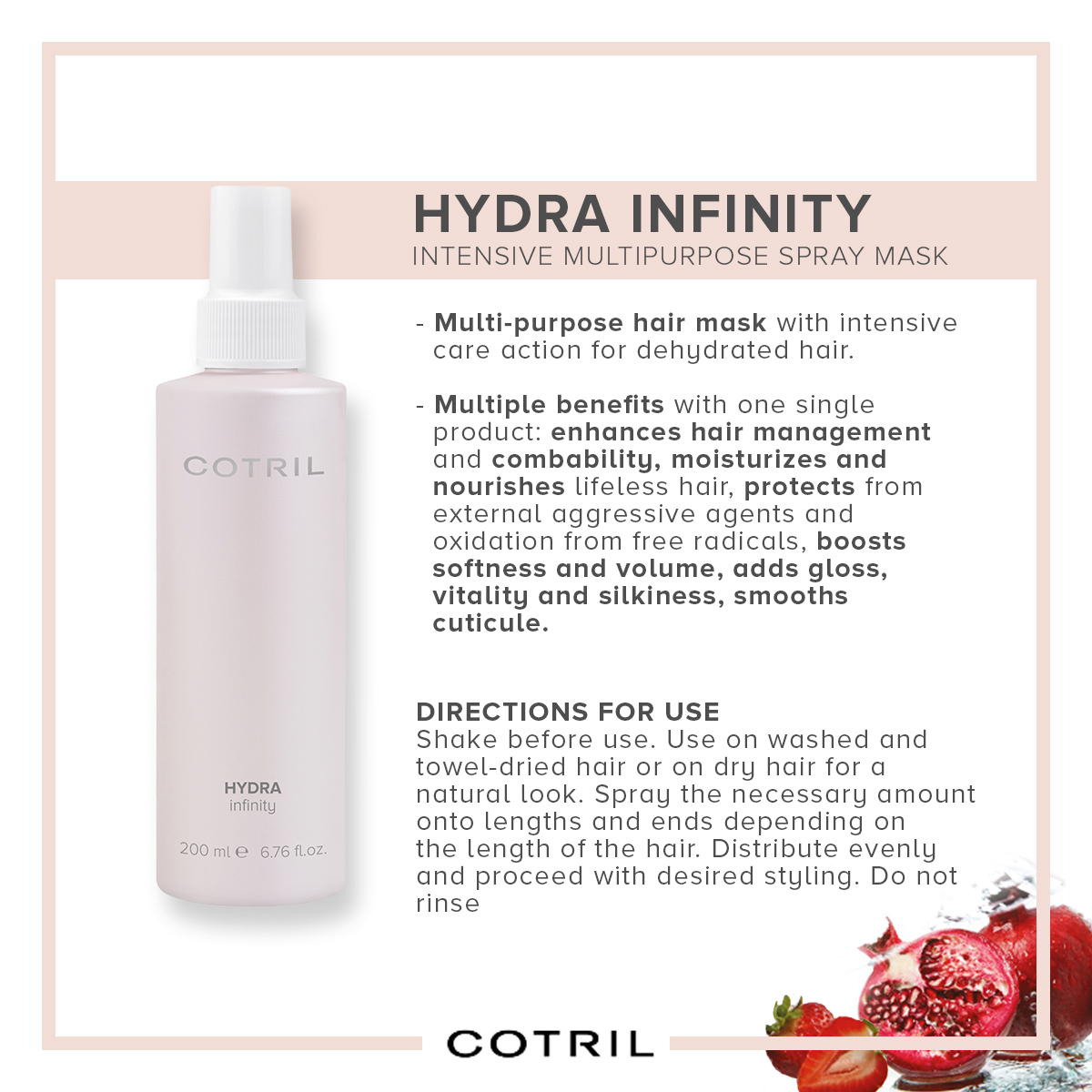 Multi-purpose hair mask with intensive care action for dehydrated hair. Multiple benefits with one single product: enhances hair management and combability, moisturizes and nourishes lifeless hair, protects from external aggressive agents and oxidation from free radicals, boosts softness and volume, adds gloss, vitality and silkiness, smooths cuticule