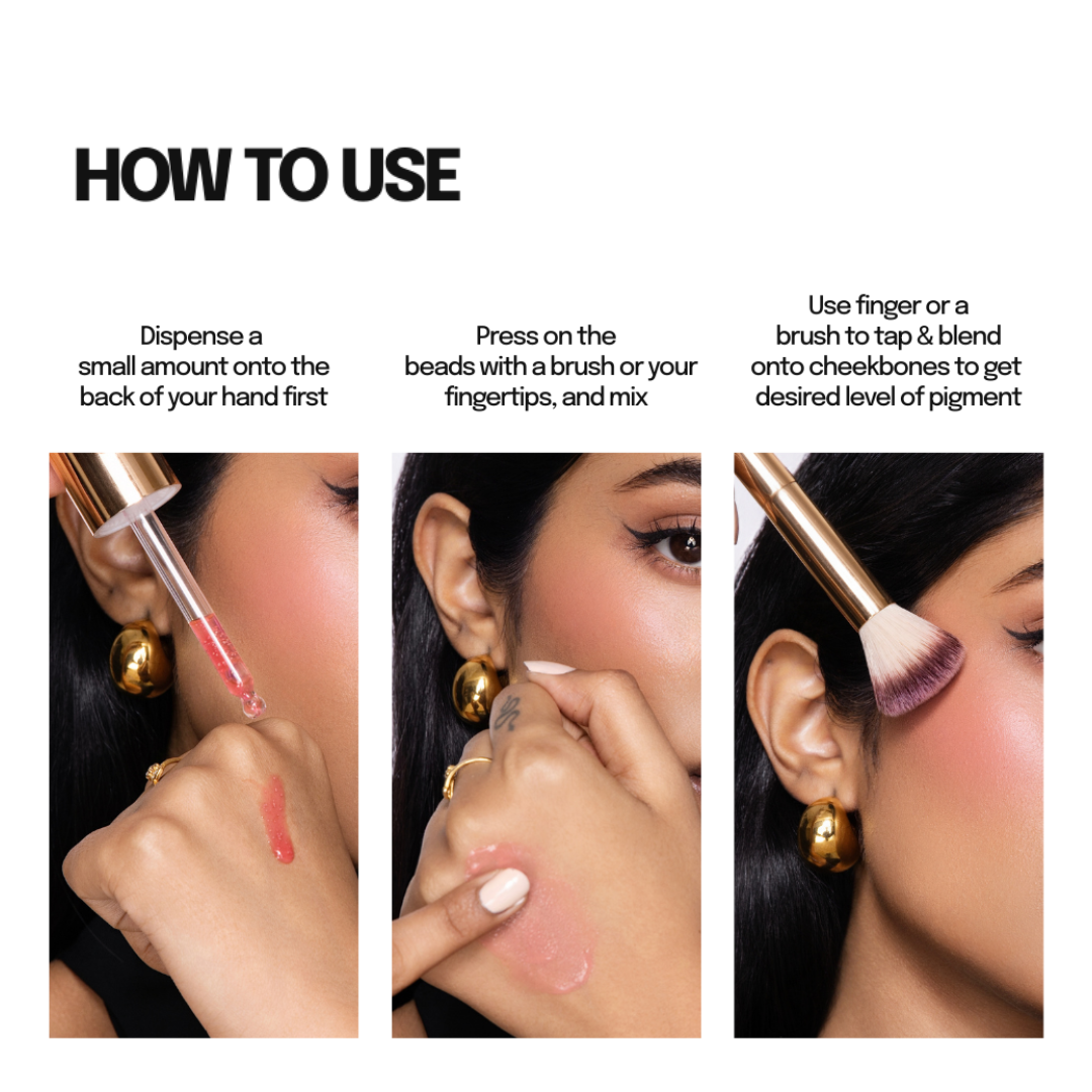 1. Dispense a small amount onto the back of your hand.2. Swirl with a brush or fingertip to break the pigment beads and activate the color. 3. Dab and blend onto cheeks for a seamless, natural flush.