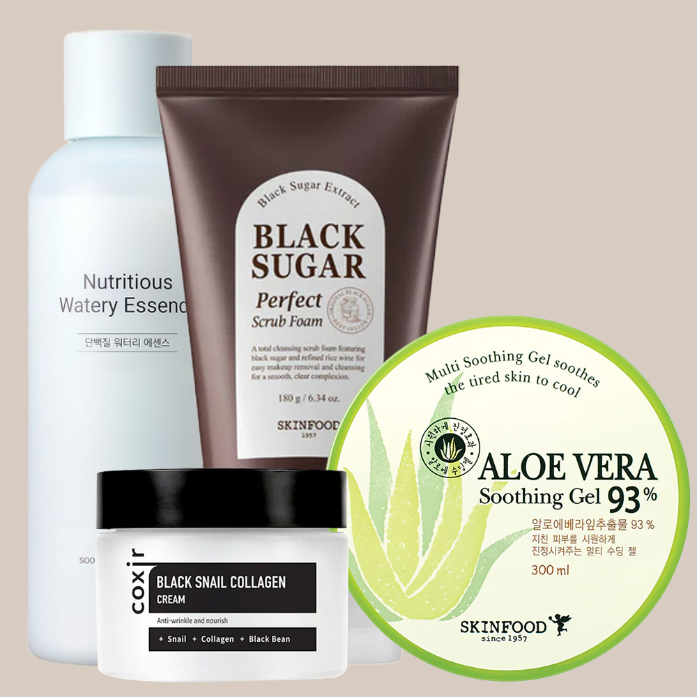 A complete hydra-repair skincare ritual designed to smooth, hydrate, and deeply nourish the skin. The Black Sugar Perfect Scrub Foam gently exfoliates and cleanses; NeafNeaf Nutritious Watery Essence provides lightweight hydration and skin nutrition; Black Snail Collagen Cream supports firmness and repair; and Skinfood Aloe Vera 93% Soothing Gel calms and refreshes the skin for an all-day glow.