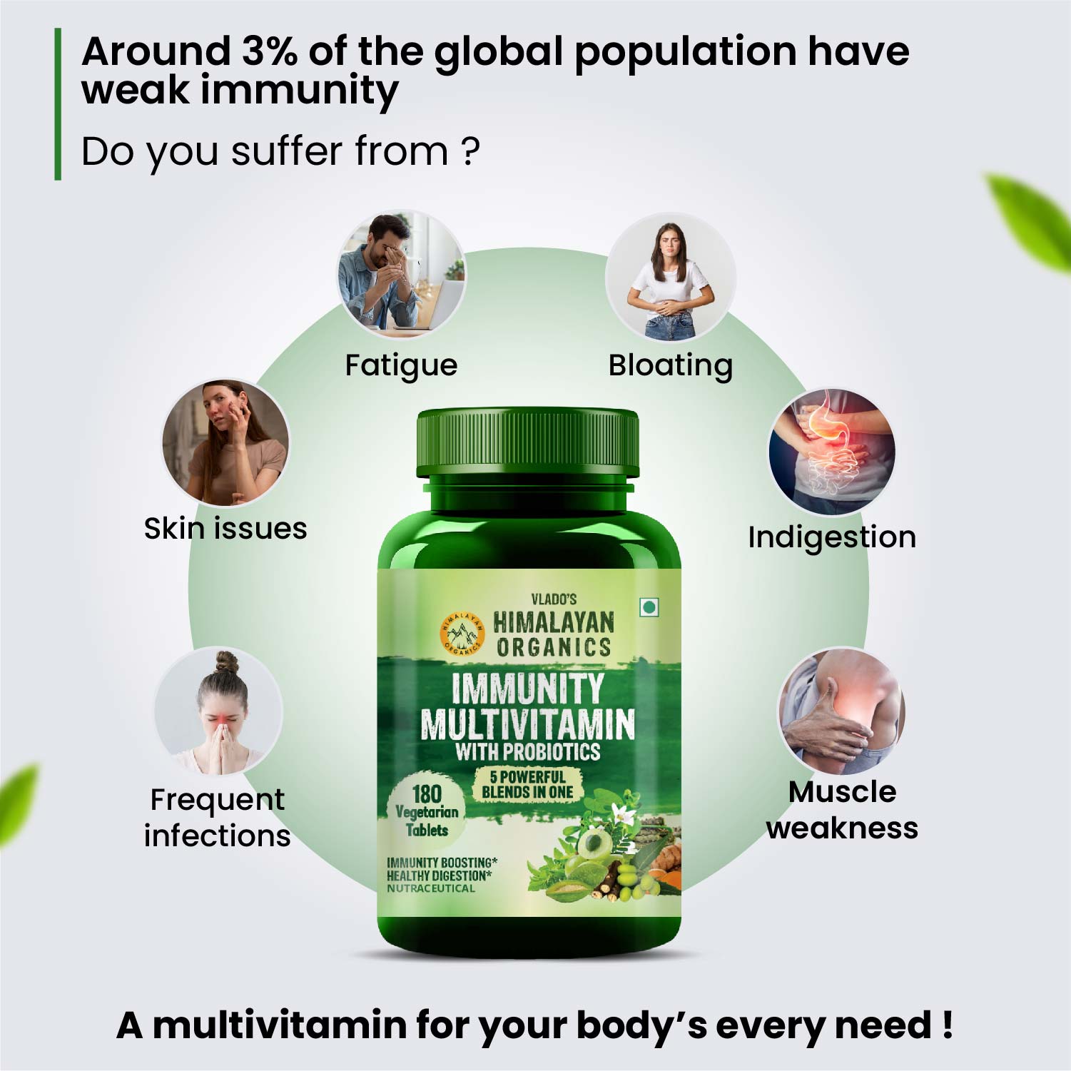 If you are looking for a whole food supplement that boosts immunity while promoting healthy gut, your search ends here! Himalayan Organics Immunity Multivitamin with Probiotics is a powerful blend of over 36 essential vitamins, minerals, and herbs. Probiotics are good bacteria that replenish the ratio of good to bad bacteria in your digestive system. The goodness of Amla, Giloy, Aloe Vera, Ginseng, Neem, Vitamin C, Vitamin B12, Magnesium, Calcium, and others promote an active lifestyle and keep you on top of your game. These ingredients strengthen bones, improve the digestion process, and provide the necessary energy to the body, thereby boosting your immunity levels. Difficult to incorporate all the vitamins, minerals, and extracts in your daily routine, these tablets perfectly fulfill vitamin deficiencies while strengthening your overll immunity!