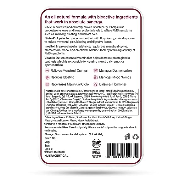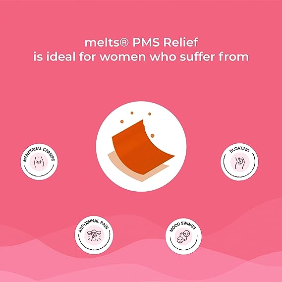 Don’t let that monthly throbbing pain or period cramps in your lower abdomen make you hit pause on life. With melts® PMS Relief, you can bid adieu to painful PMS symptoms such as cramps, bloating, abdominal discomfort, and mood swings. Specially formulated with natural and potent ingredients, these strips dissolve in your mouth within seconds, releasing all the beneficial nutrients into the bloodstream. The best part is that it does all this while allowing you to relish the flavor of soothing ginger lemon.How does it work? Each PMS care strip contains the goodness of five potent ingredients—Vitex, Ginfort®, Inositol, Vitamin D2 and Boron — that work in synergy to provide menstrual pain relief. Taking one strip daily can provide instant relief from period pain, improve gut motility, and balance hormones to improve mood. It also manages a hormone-like chemical produced during your period that is responsible for menstrual cramps in your abdomen and back pain. All ingredients used in melts® PMS Relief are obtained from 100% organic sources, have no side effects, and are free from artificial preservatives, flavors, and colors.