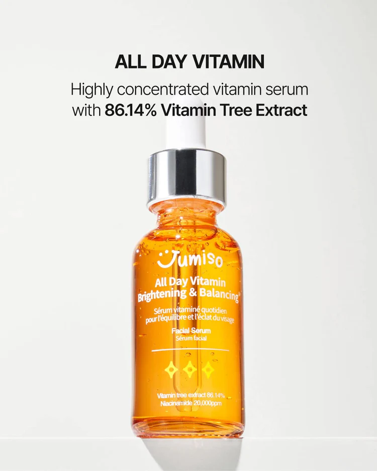 Jumiso All Day Vitamin Brightening & Balancing Facial Serum is a lightweight, fast-absorbing formula designed to deliver daily radiance and balanced skin tone. Powered by a multi-vitamin complex, including Vitamin C, A, D, E, and K, this serum helps brighten dull skin, fade dark spots, and support an even complexion. The blend of nutrients works synergistically to enhance skin vitality while improving overall texture and luminosity. Its non-sticky, gentle formula is suitable for all skin types, providing long-lasting hydration and antioxidant protection. With regular use, skin appears healthier, smoother, and visibly more radiant.