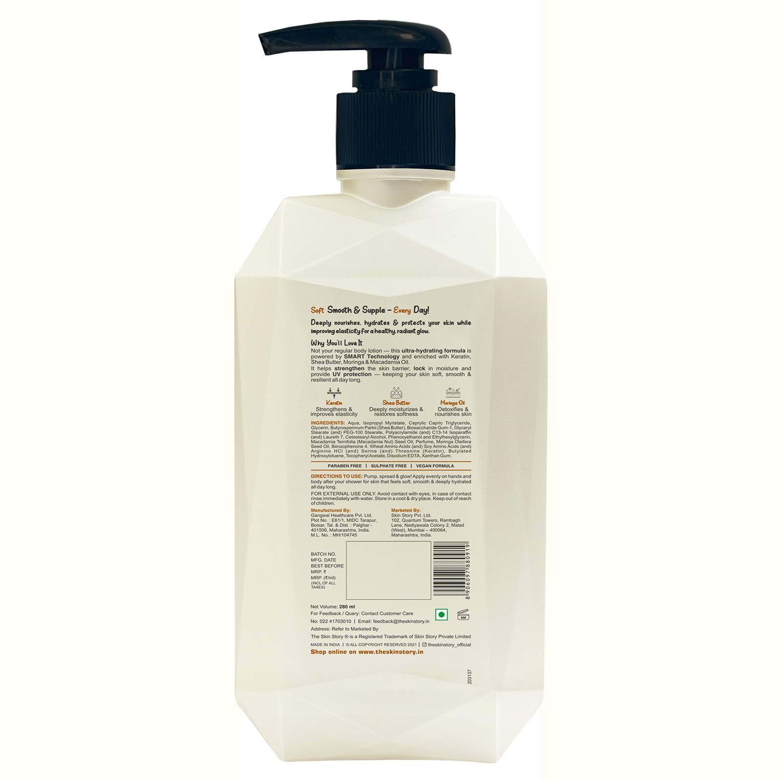 The Skin Story Keratin Lotion is formulated with SMART (soothing, moisturizing, anti-ageing, restructuring & touch) technology that employs multifunctional, safe, non toxic and active ingredients. The ultimate blend provides UV protection as an added layer of protection. Keratin increases hydration and elasticity of the skin leaving it significantly supple post every use.