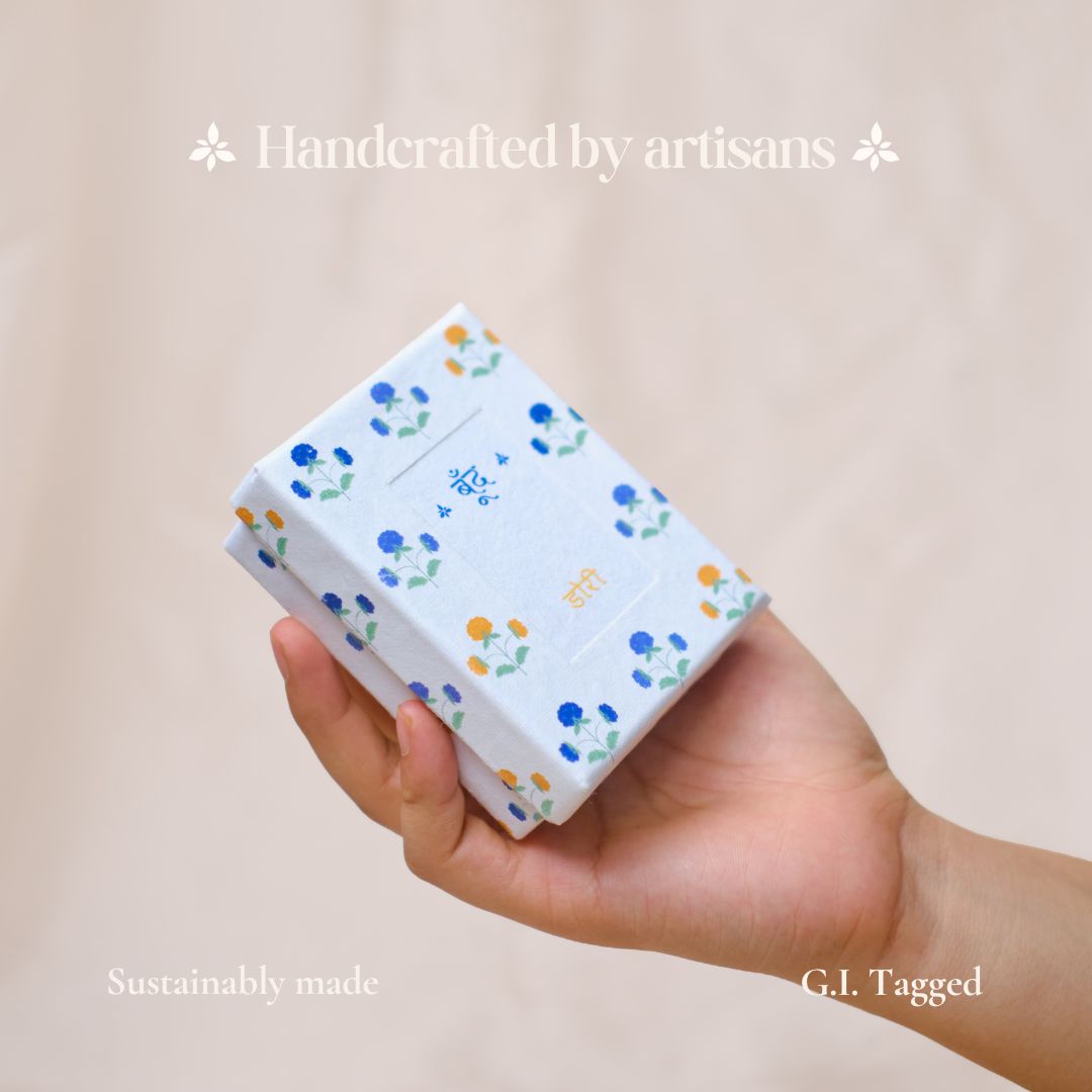 Handcrafted, plastic-free packaging: The fragrance box is crafted by artisans using recycled handmade paper from cotton scraps. The packaging is completely plastic free.