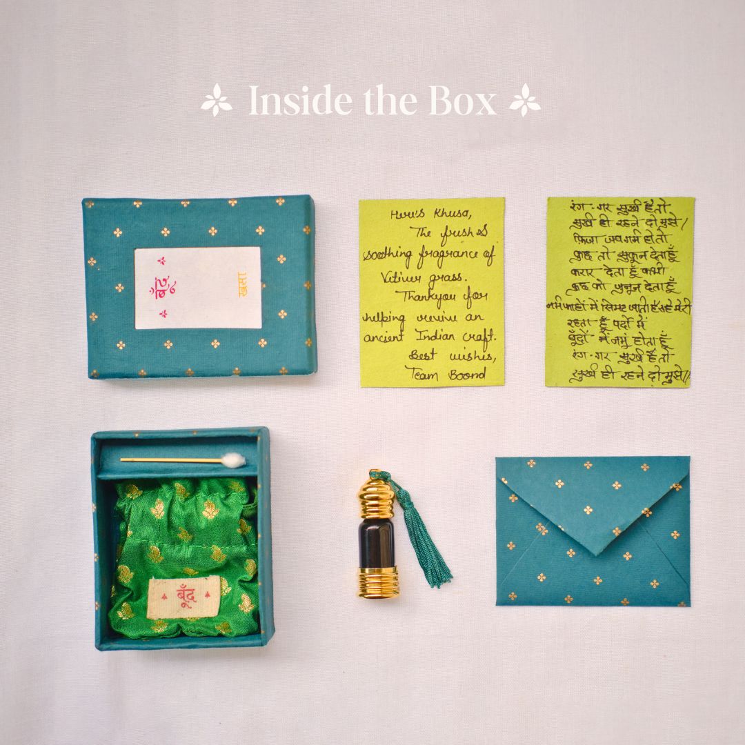 Soothing Vetiver fragrance: The Boond Khusa (Vetiver) fragrance is the fresh and soothing fragrance of Vetiver Grass. Alcohol-free, natural & pure: The fragrance is completely pure and natural. It does not contain alcohol or any chemicals. It is made from natural materials that are sourced responsibly from across India. Handcrafted to evoke a fresh & soothing feeling: Expertly handcrafted by artisans to evoke a fresh & soothing feeling. Earthy, woody & grassy notes: This is a unisex fragrance that comes with earthy, woody & grassy notes that last 6-8 hours. 100% authentic. G.I tagged: This product is conferred with the Geographical Indicator (GI) Tag by the Government of India for authentic Kannauj Perfume. Made sustainably: Each element of the box, from the fragrance to its packaging are made from ethically and locally sourced materials. The making process is sustainable, cruelty-free and environmentally friendly. Handcrafted, plastic-free packaging: The fragrance box is crafted by artisans using recycled handmade paper from cotton scraps. The packaging is completely plastic free. Perfect & unique gift for special occasions: Each handmade box is a unique and cherished gift for any occasion for friends, families and colleagues.