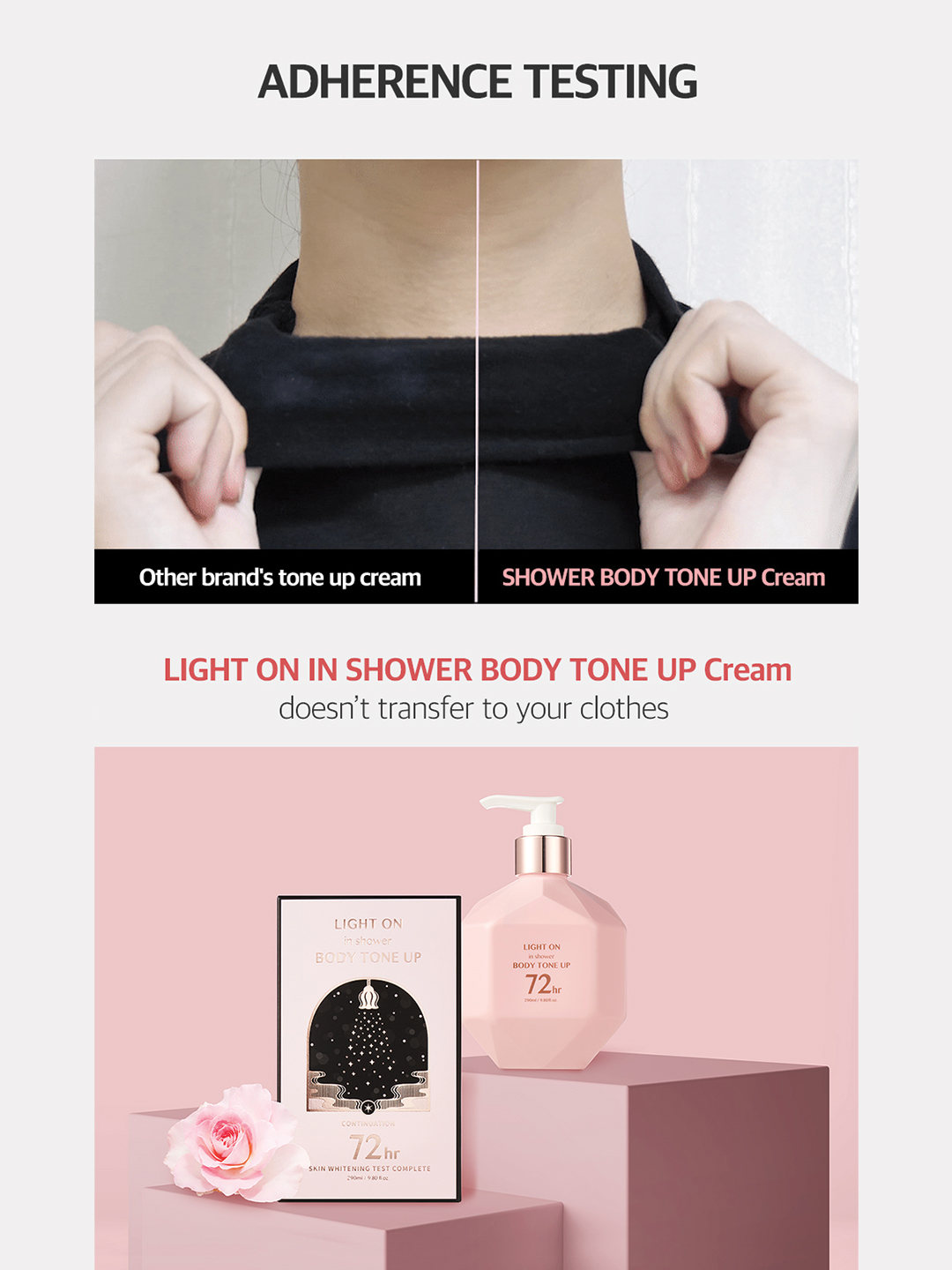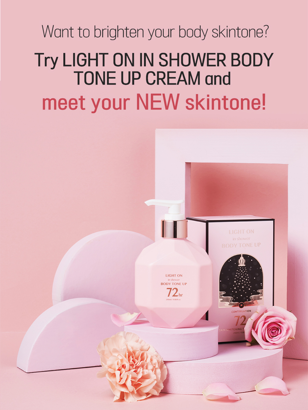 LIGHT ON In - Shower Body Tone-Up is a convenient and hydrating body lotion designed to be used during your shower routine. Its lightweight formula absorbs quickly, helping to moisturize and brighten your skin while you cleanse. Enriched with skin-nourishing ingredients, it promotes an even skin tone, leaving your body feeling soft, smooth, and radiant. Perfect for those who want hydrated, luminous skin with minimal effort, all while in the shower.