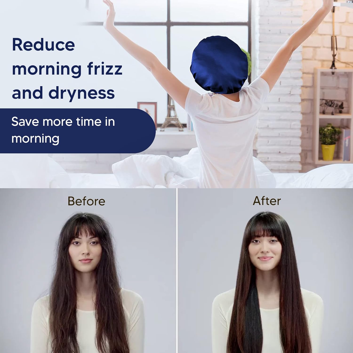 Our sleep cap helps keep moisture in hair and reduce frizz and tangles, so you have smooth hair in the morning. The sleep bonnet is designed to accommodate more hair, great for women with curly hair, natural hair, straight hair and braids.