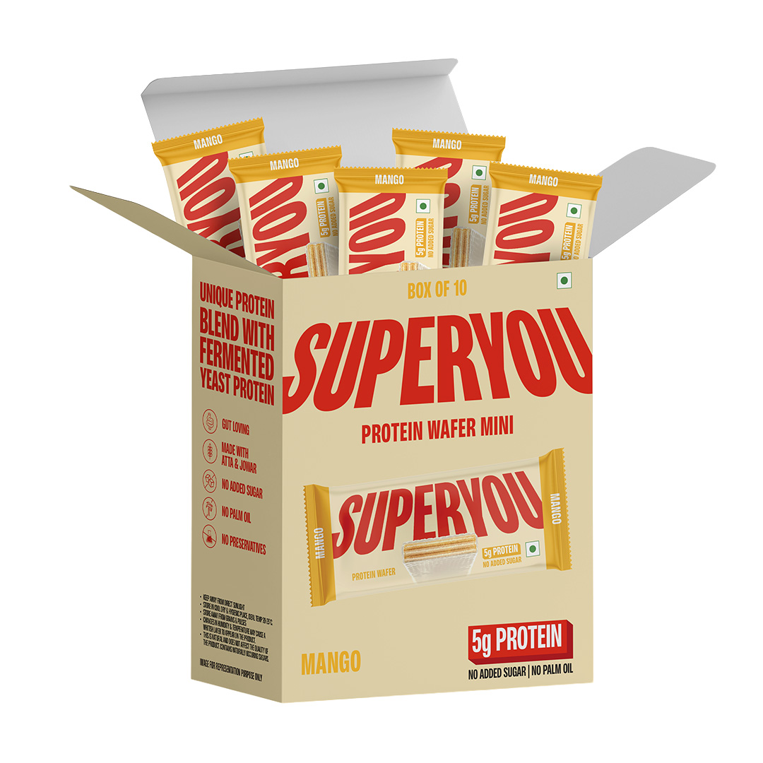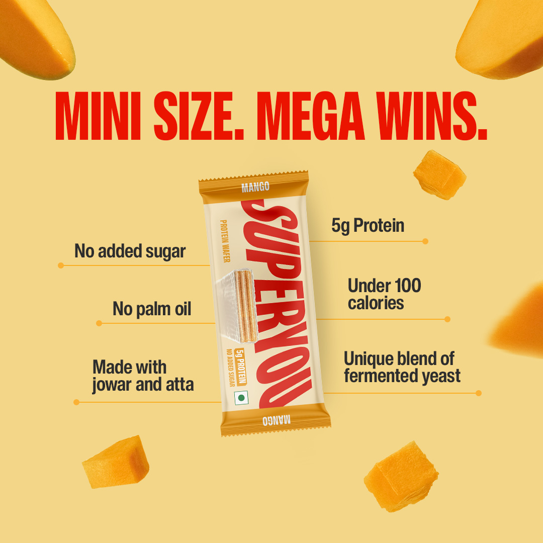 THREE FLAVOURS. ENDLESS MOODS, Mango Juicy, summery indulgence, now with protein. Cookies & Cream The creamiest crunch, with a protein boost. Choco Hazelnut Rich, nutty, and mighty delicious. Try them all. Keep them all. Share? Not really. WHEN TO SNACK ON SUPERYOU MINIS? Between Zoom calls, when you just want something smallPost-workout, for a light protein boost, On the move- train, flight, or car snack, As a perfectly sized dessert, without the guilt, Anytime you want a mini celebration. WHY SUPERYOU MINIS WORK - 5g yeast-fermented protein in every 20g chocolate, Under 100 calories, indulgence without compromise, Travel-friendly, pocket-sized format, Made with atta & jowar, No palm oil. No added sugar. No maida. Mini but maaad. Indulgence meets strength.