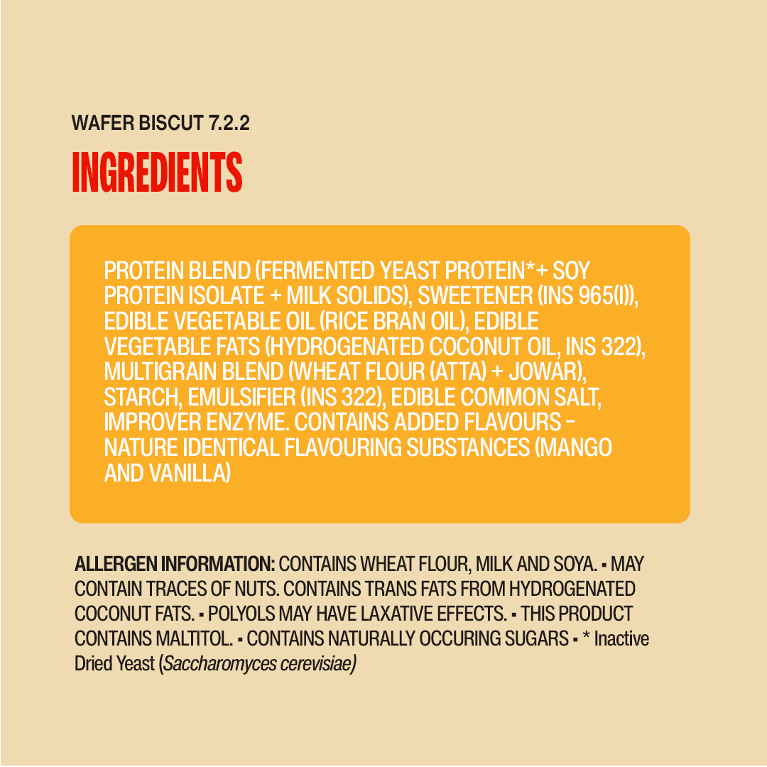 Protein Blend (Fermented Nutritional Yeast Protein + Soy Protein Isolate + Milk Solid),Sweetener (INS 965 (i)),Edible Vegetable Oil (Rice Bran Oil), Edible Vegetable Fats ( Hydrogenated Coconut oils, INS322), Multigrain Blend (Wheat Flour (Atta) + Jowar),