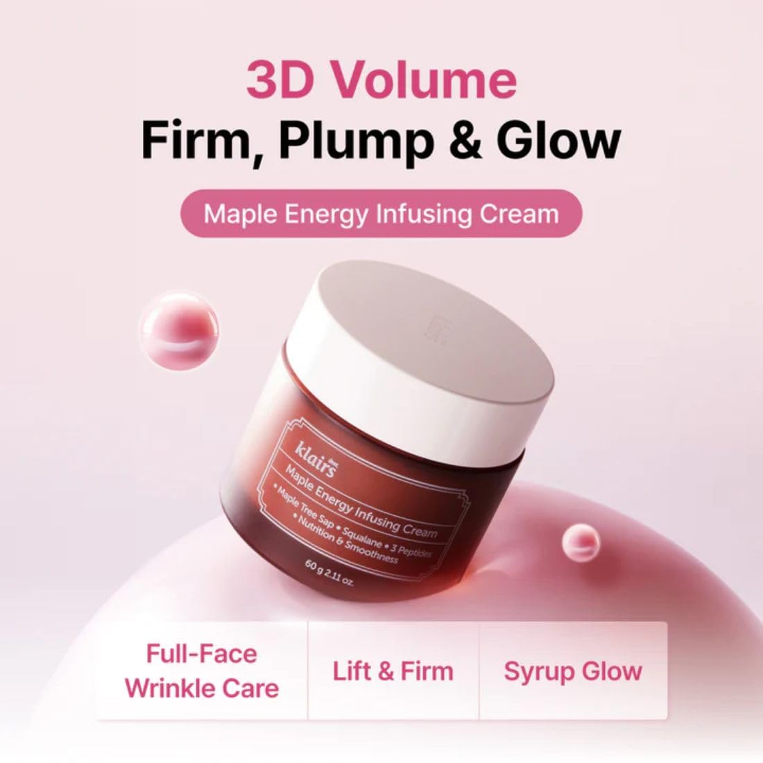 Firm, Plump and Glow with the Dear Klairs Maple Energy Infusing Cream, a rich, nourishing cream packed with concentrated maple sap that strengthens your skin barrier and is also perfect for sensitive skin. Infuse your skin with radiance and enhance your glow from within with Maple Revitalizer, Squalane, and a 3 Peptide Complex. Improve the appearance of bare skin and texture with just one use. Experience deep nourishment from maple trees through the cream's rich, non-sticky texture, which absorbs comfortably to deliver hydration and elasticity deep into the skin.Reduces fine lines and wrinkles in 12 facial areas, including eyes, forehead, and lips. Enjoy 3-Tier Plumping with enhanced skin density, deep elasticity improvement, and boosted recovery. Experience 3D Lifting for a contoured 3° skin lift.