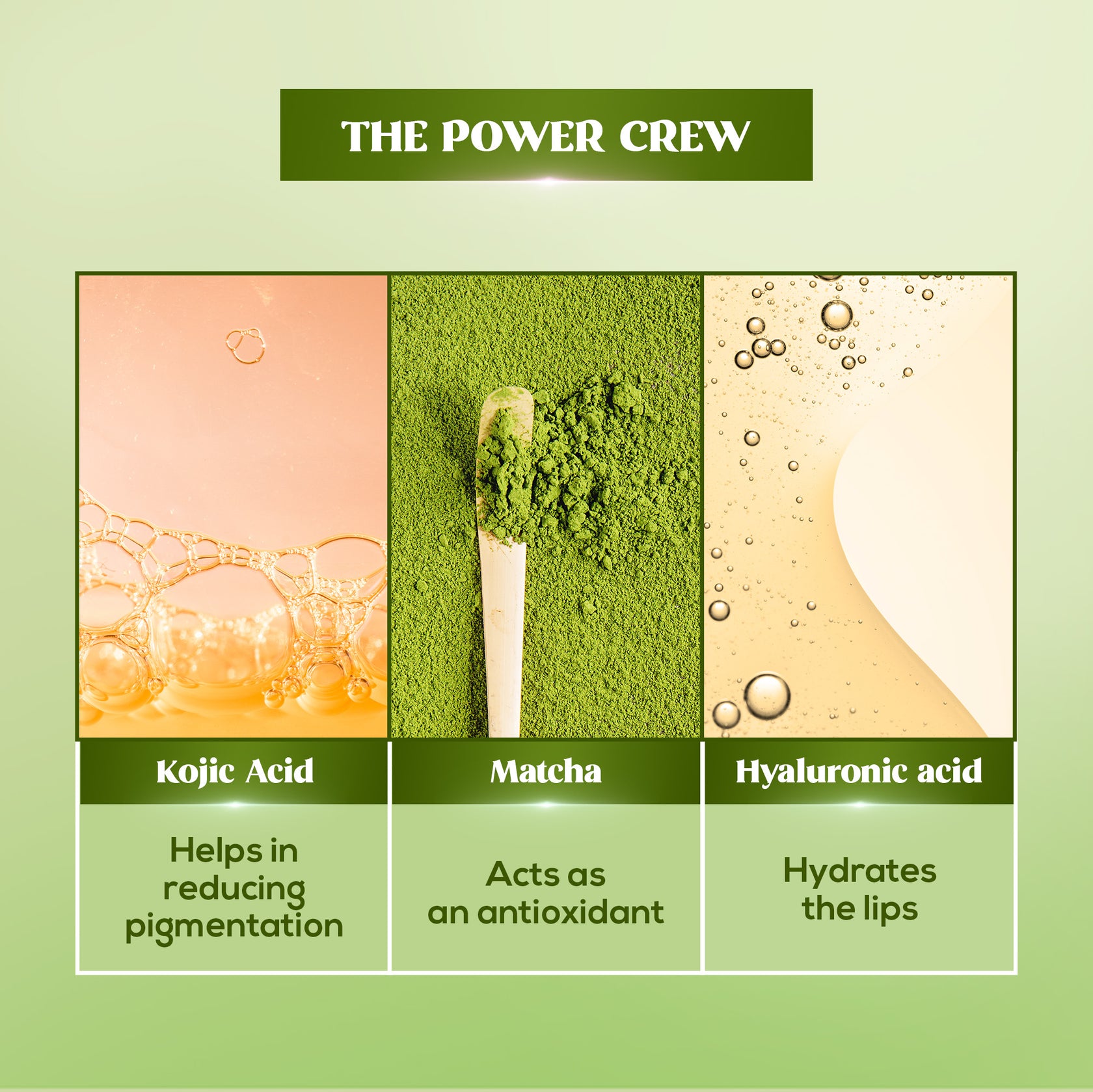 Shea Butter, Matcha Oil, CCTG Hydrogenated Polyisobutene, Diisostearyl Malate, Petrolatum, Euphorbia Cerifera Cera