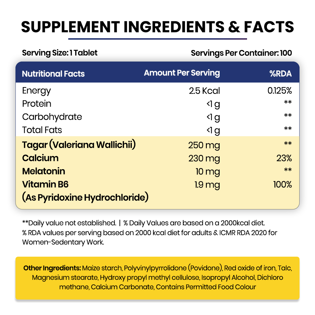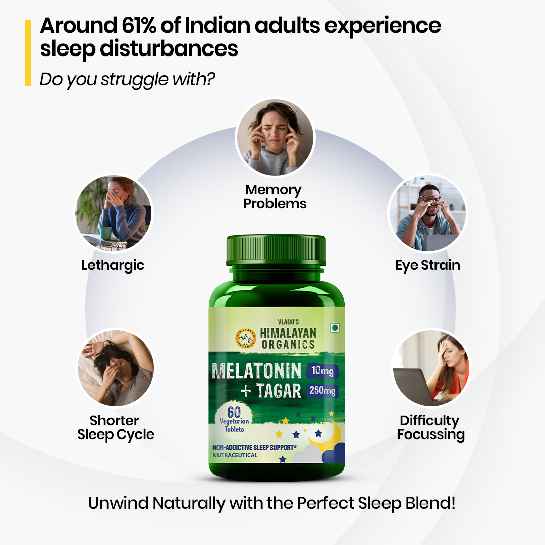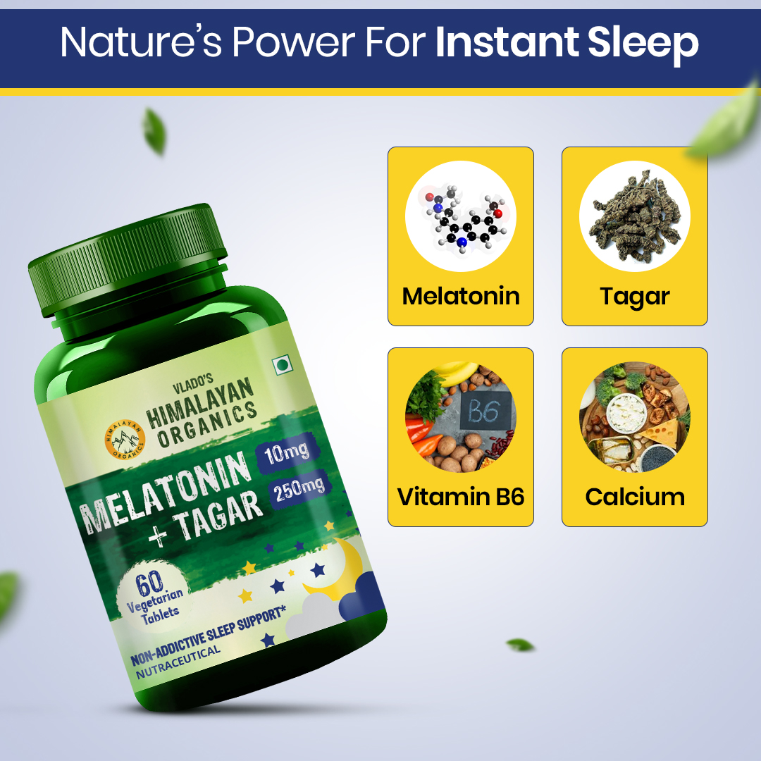 Bid farewell to dissatisfactory sleep days and Sleep like a baby with Himalayan Organics Melatonin + Tagar supplement. It contains 120 vegan and gluten-free tablets for uninterrupted sleep. These tablets are a peaceful sleep formula and are host to other benefits like relief from stress, enhanced performance, improved eye health, better concentration, and a cheerful mood. Melatonin is a hormone produced by the pineal gland in your brain and regulates the body's rhythm to manage your sleep cycle. Increasing stress and pressure have disturbed the sleep cycle and patterns leading to interrupted sleep. But no more. Cherish your peaceful sleep with Himalayan Organics Melatonin + Tagar Tablets and wake up all refreshed, rejuvenated, and recharged for your daily activities.