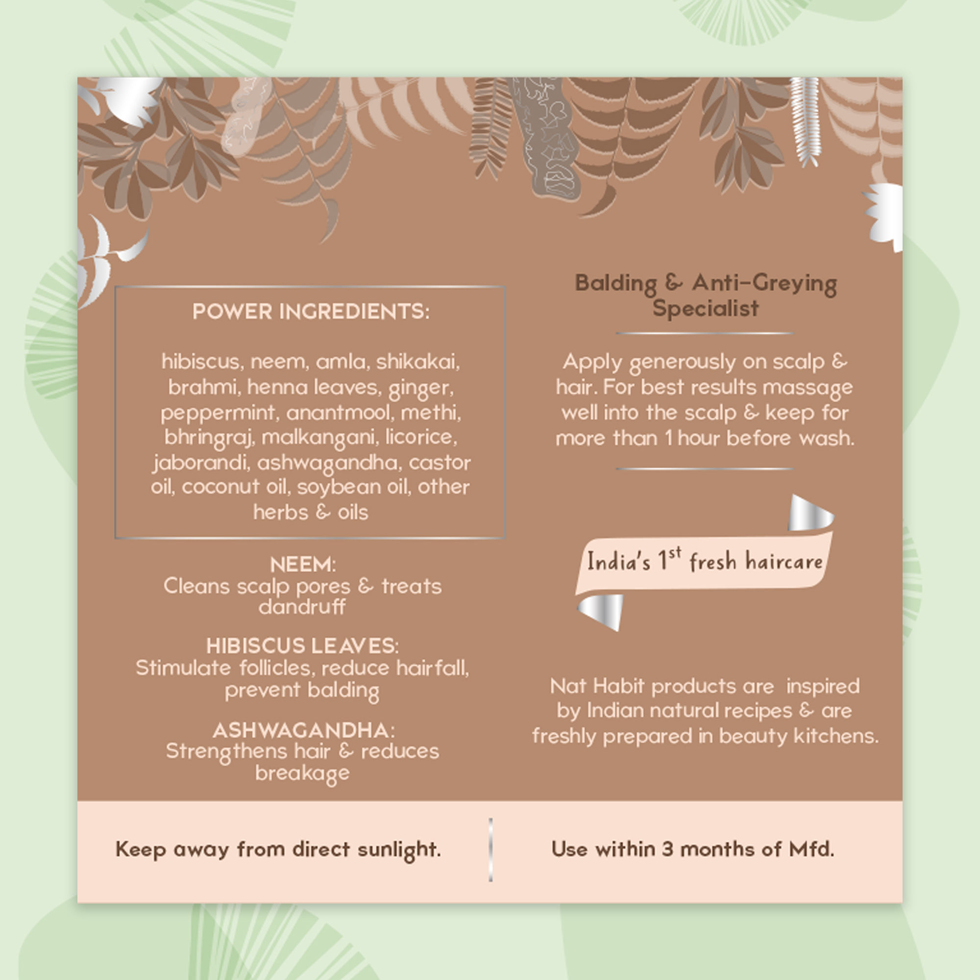 - Hibiscus, Neem, Amla, Shikakai, Brahmi, Henna Leaves, Ginger, Peppermint, Anantmool, Methi, Bhringraj, Malkangani, Licorice, Jaborandi, Ashwagandha, Castor Oil, Coconut Oil, Soybean Oil, Other...Read more