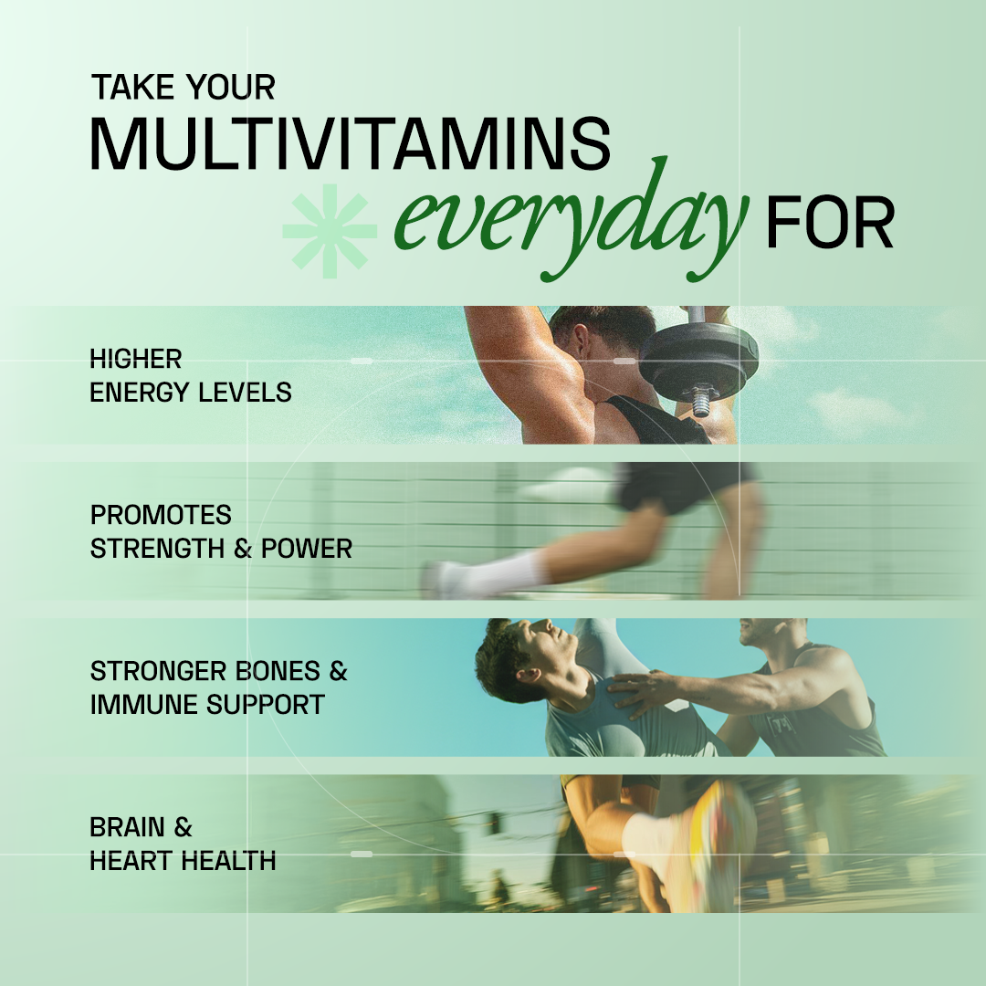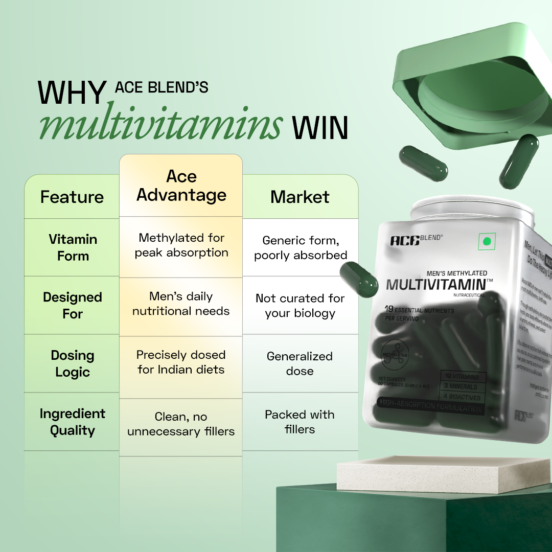 Ace Blend Multivitamin for Men is a precision-formulated, once-daily supplement designed to support the modern mans nutritional needs. Each tablet delivers 19 essential nutrients, including 12 vitamins, 3 minerals, and 4 bioactives - curated to support energy levels, immunity, focus, heart health, and overall wellness.