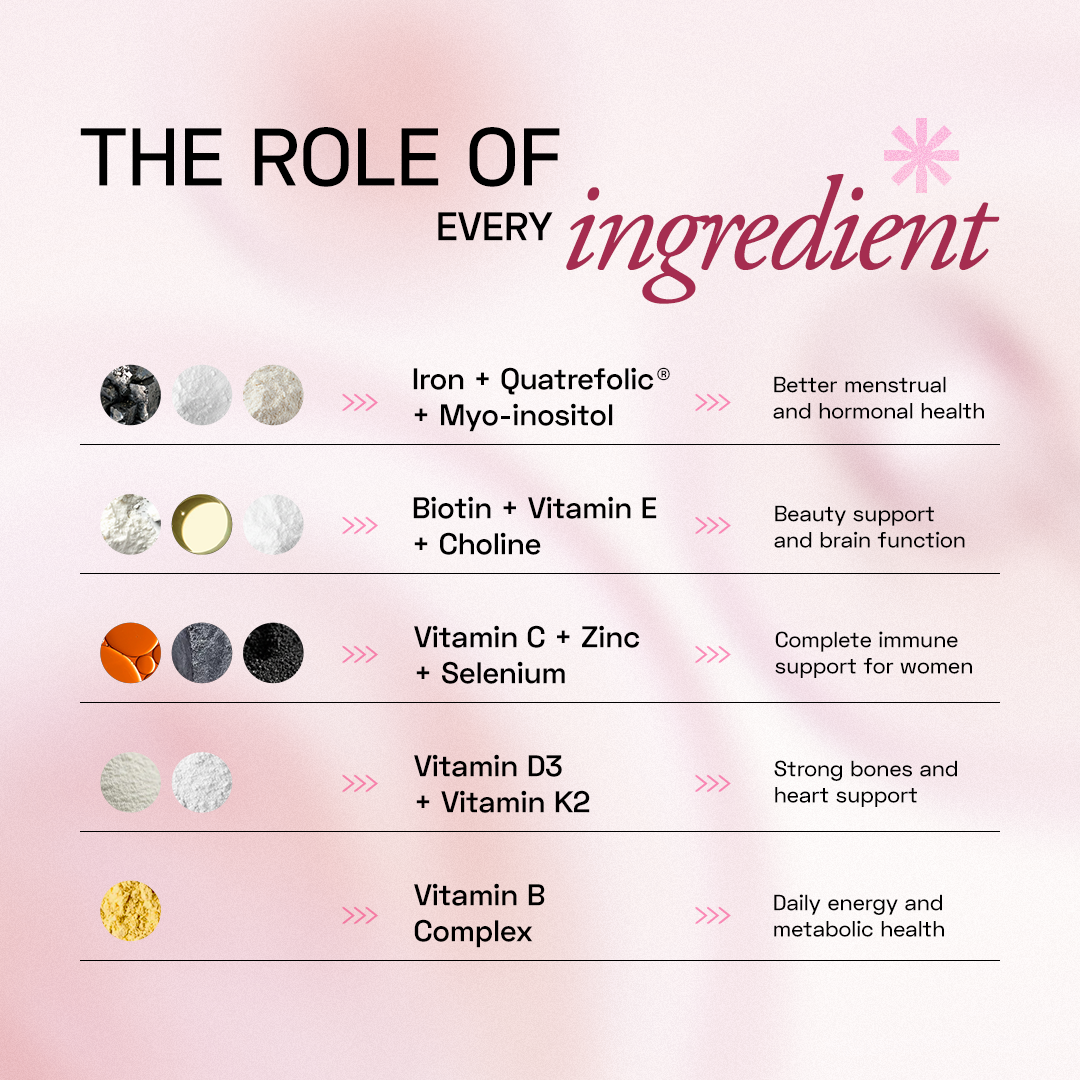 Built with methylated (active) B-vitamins and Quatrefolic®, this advanced formula provides nutrients in their ready-to-use form, helping improve utilization in the body. Enriched with Iron, Myo-Inositol, MenaQ7® Vitamin K2, and Vitashine® vegan Vitamin D3, it supports women through different life stages with targeted, high-quality nutrition.