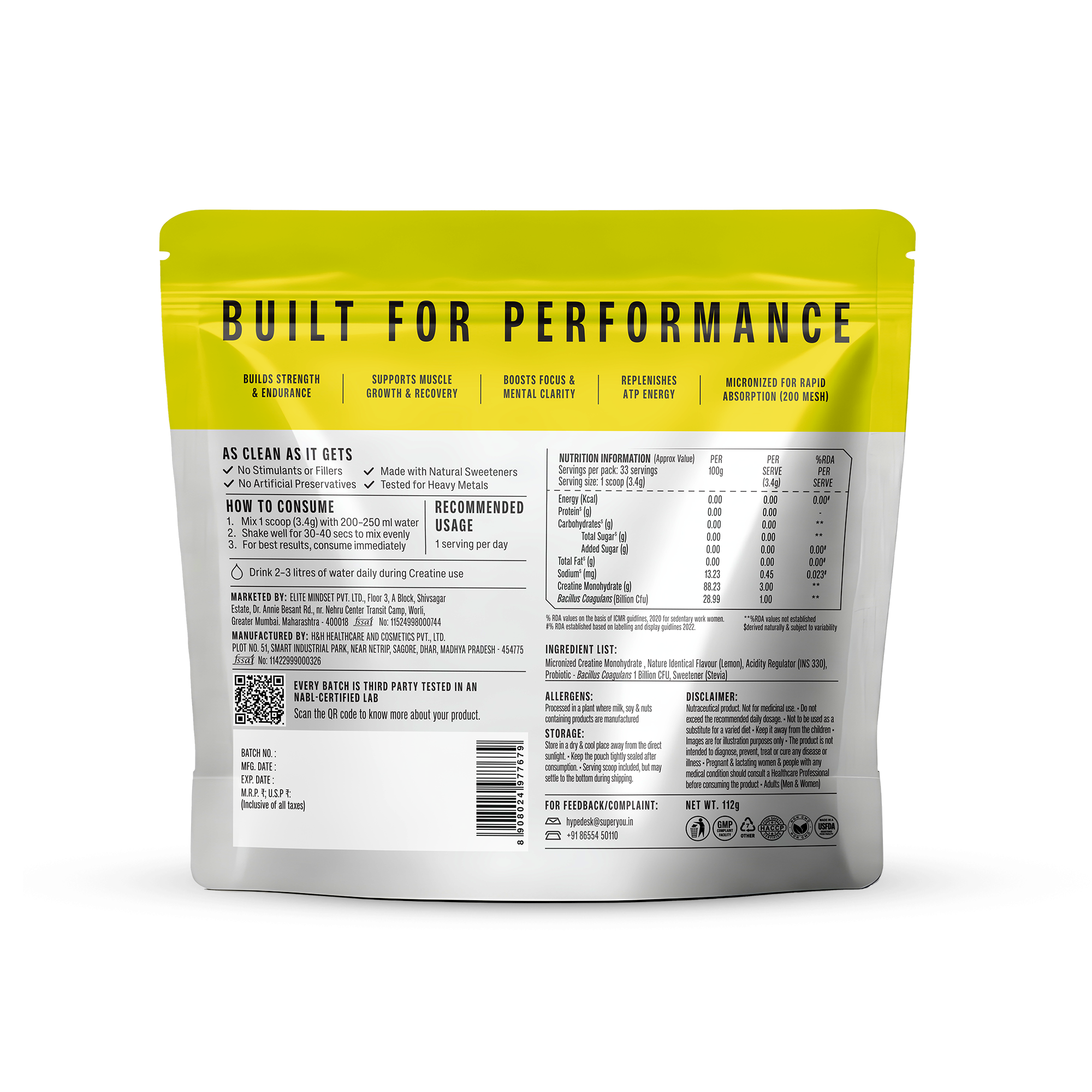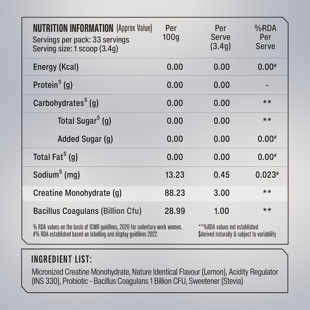 Creatine Monohydrate (Micronized) , Nature Identical Flavour (Lemon), Acidity Regulator (INS 330), Sweetener (Stevia), Probiotic - Bacillus Coagulans 1 Billion CFU.