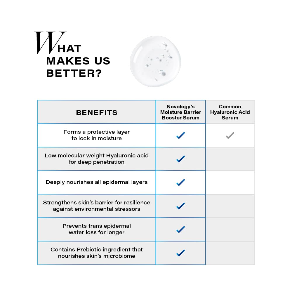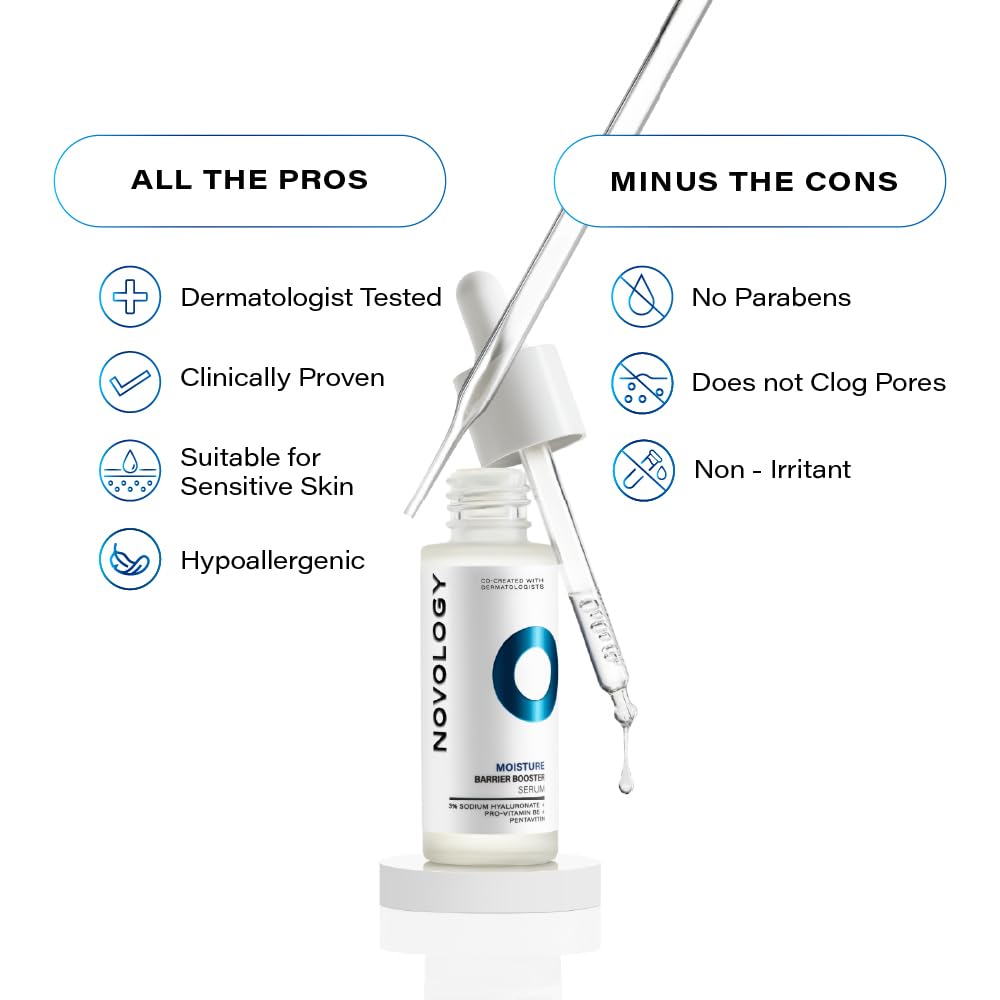 Novology's Moisture Barrier Booster Serum, co-created with dermatologists, is clinically proven to seal in moisture for 48 hrs and boost skin barrier resiliency. It's a non-sticky, quick-absorbing formula that seals in moisture for continuous hydration. TARGETED SKIN CONCERNS This Face Serum can be used on Dull, Dry and Dehydrated Skin. It Seals In Moisture for Intense Hydration. PATENTED HYA-B5 TECHNOLOGY Formulated with Potent Active Ingredients - Sodium Hyaluronate Complex: 4 different molecular weight of Sodium Hyaluronate that locks in moisture to provide Intense Hydration - Pro-Vitamin B5: Known to accelerate skin restoration - Pentavitin: Hydrates, Moisturizes and Protects the Skin from Dehydration Novology's Moisture Barrier Booster Serum features Beneficial Prebiotic Ingredients that nourish your skin's microbiome, by sealing in moisture for continuous hydration. HIGHLIGHTS Non-comedogenic It is hypoallergenic Suitable for sensitive skin USAGE RECOMMENDATIONS Gently massage 3-4 drops on cleansed face and neck in an upward motion until the serum gets absorbed. Use twice daily. SAFETY INFORMATION For external use only. Avoid contact with eyes, in case of contact, rinse thoroughly with water. Stop using it and consult a doctor if rash occurs. To be used on intact skin and not on cut or abraded skin.