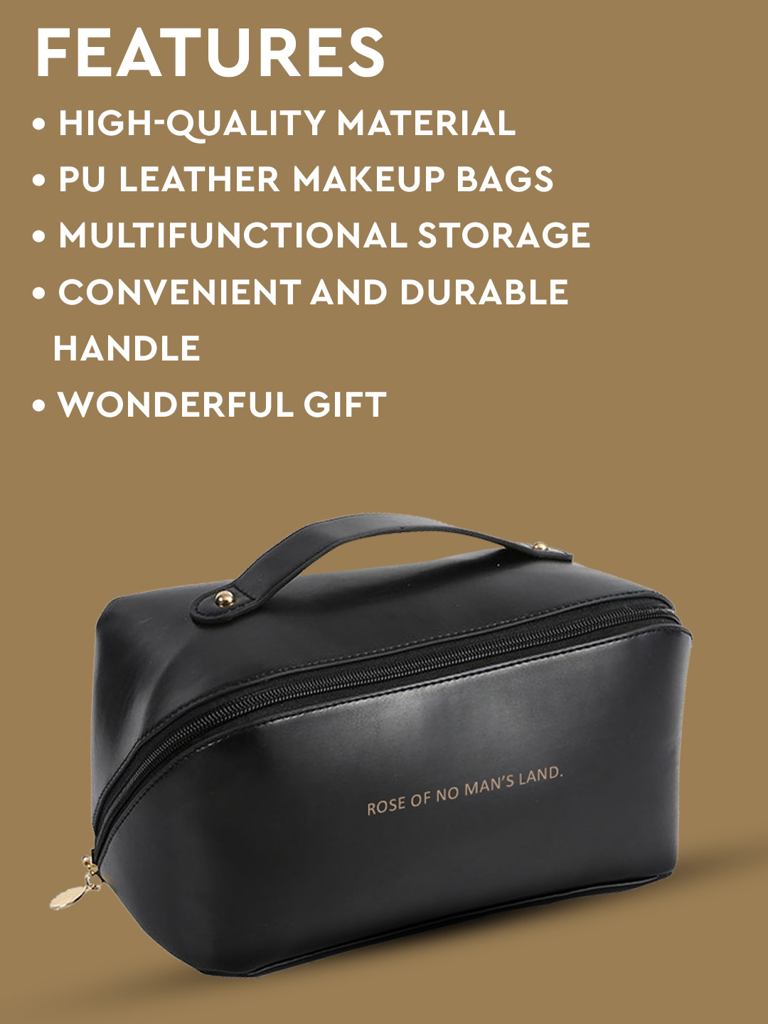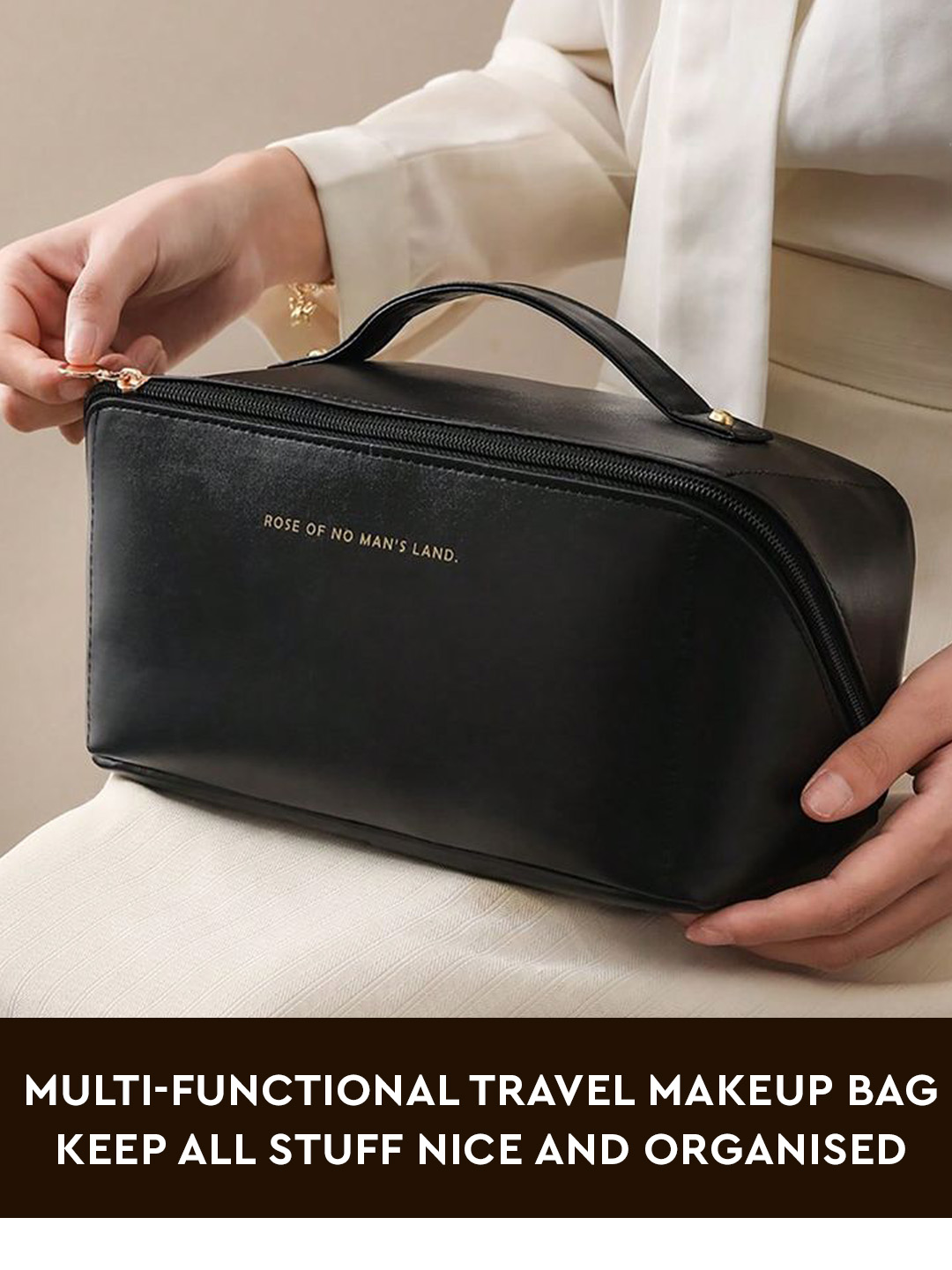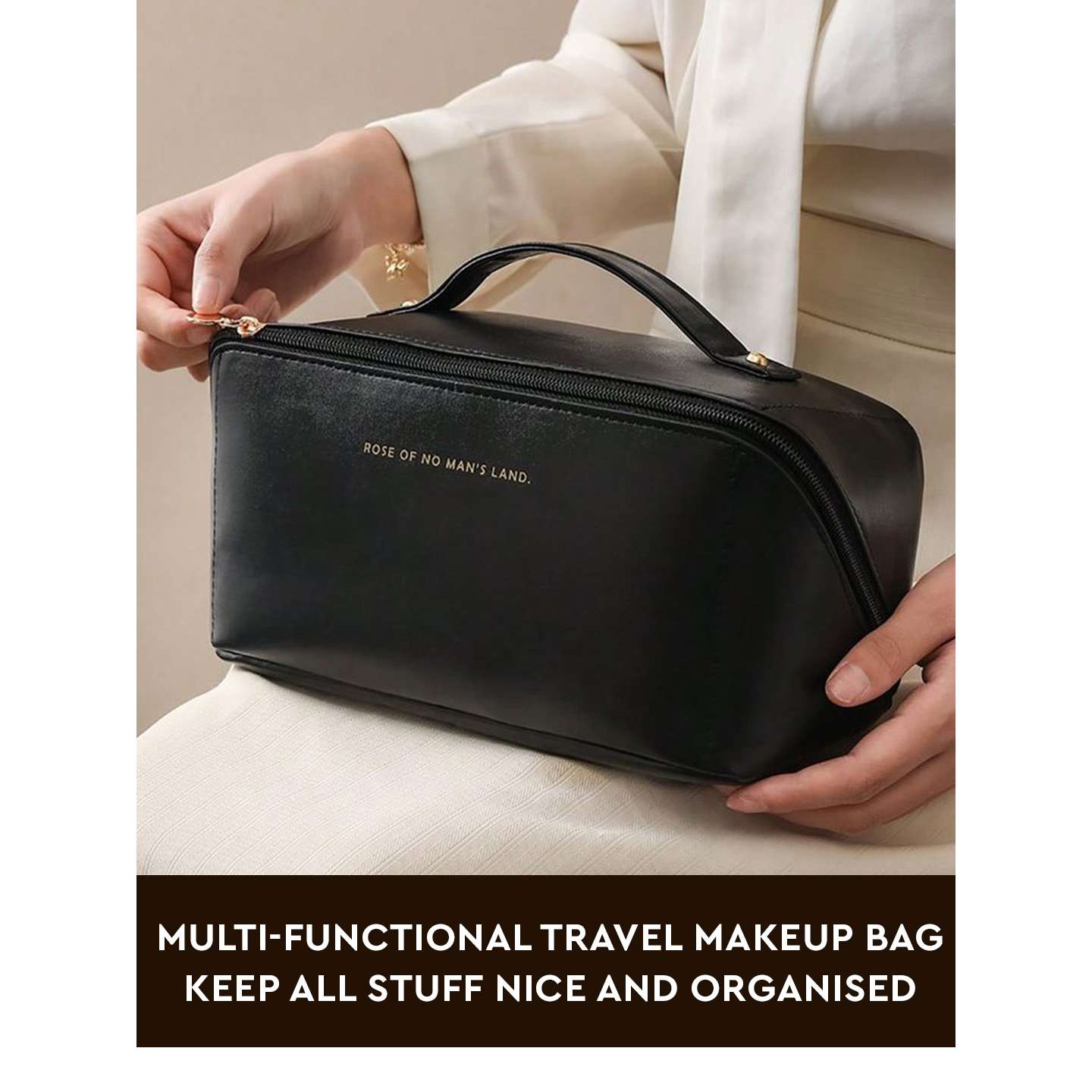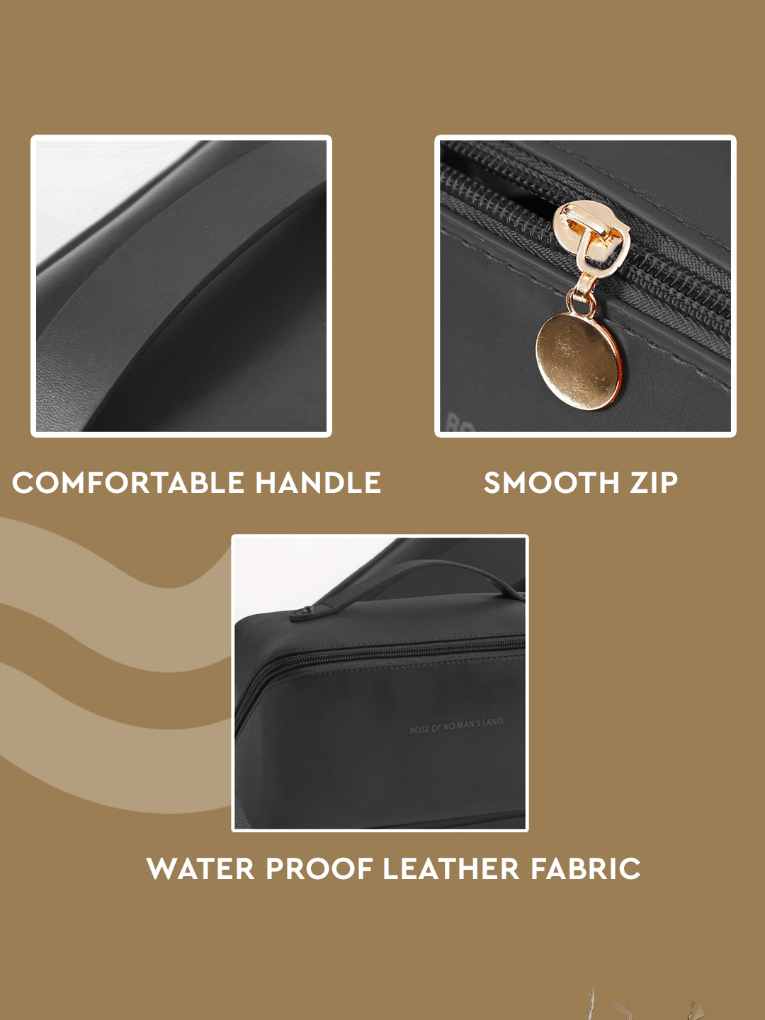 Indulge in luxury with our Travel Makeup Pouch, meticulously designed with top-tier materials. Crafted from easy-to-clean PU leather fabric and featuring a special water-resistant surface, this pouch safeguards your products from moisture, ensuring they stay dry and intact. Its portable and lightweight design, complete with a convenient handle, offers effortless carrying, and the robust thickness enhances durability while simplifying cleaning. Say goodbye to concerns about messy leaks during your travels. This multifunctional makeup bag goes beyond cosmetics; it's perfect for storing jewelry, electronic accessories, cameras, essential oils, toiletries, shaving kits, glasses, and valuable items. The well-thought-out zipper opening design is not only easy to handle but also incredibly practical. With its stylish gift box, this travel makeup bag makes an ideal present for women and girls, whether it's for Mother's Day, Women's Day, or Christmas. Elevate your travel experience with this essential accessory, combining sophistication with functionality.