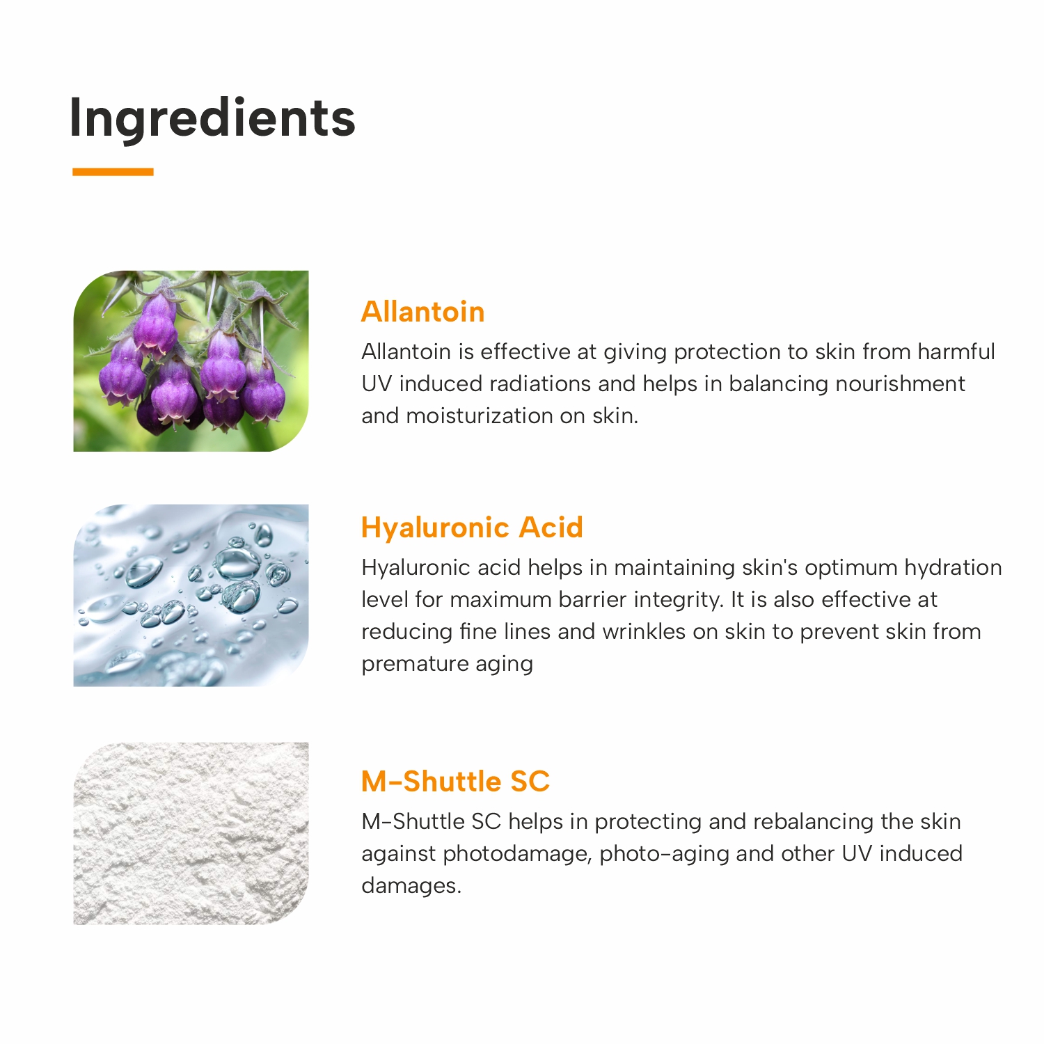 ANTI-AGING FORMULA : The key actives used in this formulation help to reduce fine lines and wrinkles and thus helping in preventing the skin from premature aging due to sun exposure.
