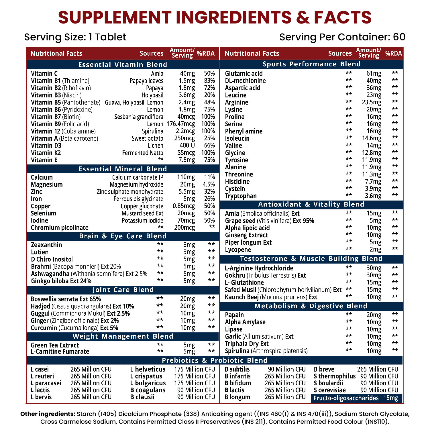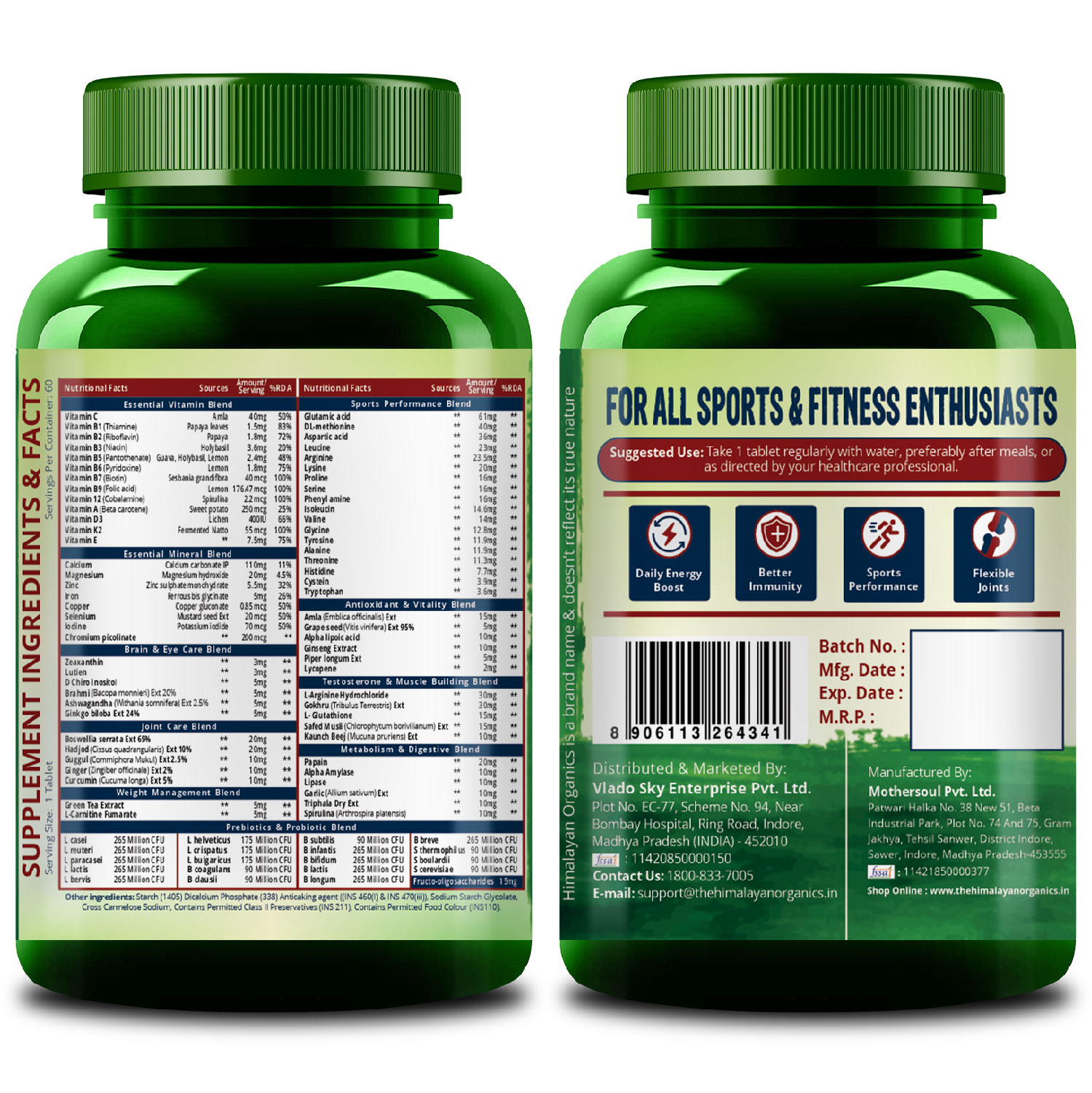 An advanced formula made up of 60+ nutrients and 13 performance blends for upscaling your sports performance every day. Himalayan Organics Multivitamin Sports is a wholesome superfood for efficient and active functioning. These tablets are a thoughtful combination of vitamins blend, minerals blend, brain & eye blend, joint-care blend, amino acid blend, antioxidants & vitality blends, metabolism & Phyto blend, weight management blend, testosterone & muscle blend, and probiotics. It is your soul food for 20X sports performance. Fitness Freaks, Athletes & Performers, time to stay at the top of your game by refreshing, nourishing, and enriching yourselves daily!