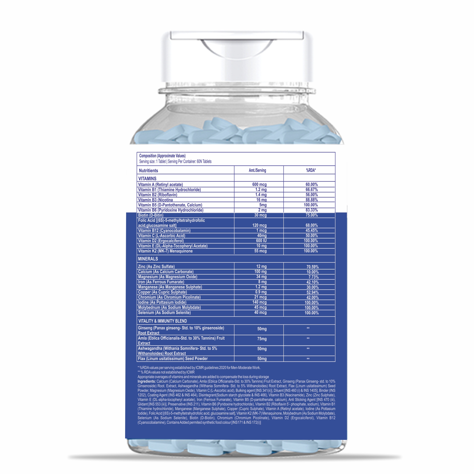 Maintaining a healthy lifestyle becomes difficult in a high paced environment. Fortunately, Dr. Morepen is here to offer you, Multivitamin Tablets For Men, a sure shot supplement that compliments your daily work routine! It fulfils your bodys needs from head-to-toe by providing Vitamin- B1, B2, B3, B6, B12, C, D2, E, Biotin (Vitamin-H) and Folic Acid (Vitamin B9) along with essential Minerals like Calcium, Iron, Zinc, Copper, Iodine, Manganese, Chromium, Magnesium etc. The tablets also contain the goodness of Omega-3, Inositol, Choline with Herbal Power of Ashwagandha, Safed Musli, Valerian, Kaunj, Ginseng and Akarkara Extracts. These Multivitamin Tablets will keep you energized and healthy in a long run to help you make the most of your life & fly high! Try today.