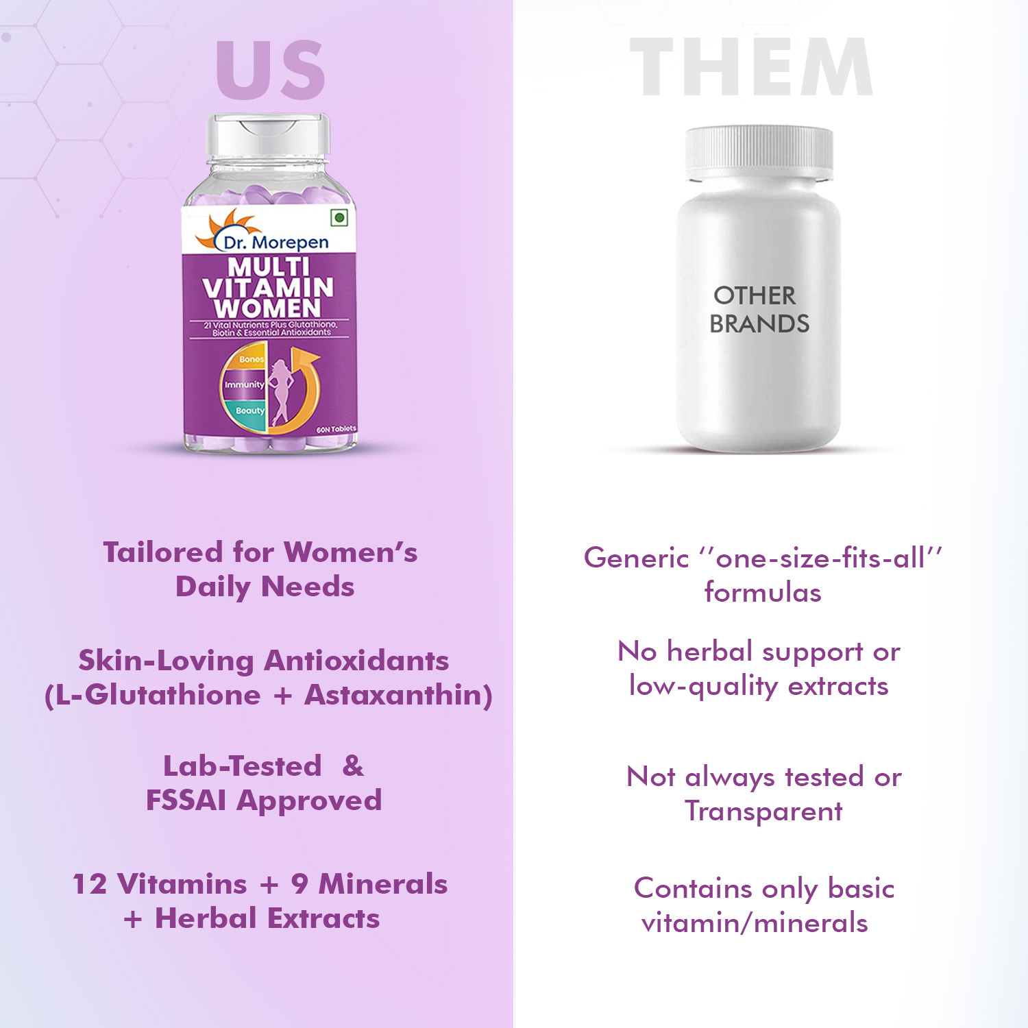 Todays women are the 24/7 hustlers and need plenty of nutrients to cope with it. But a highly active lifestyle often comes at a cost of rushed meals, half diets and fast food. Well, No worries! Dr. Morepen is here to care for you with Multivitamin Tablets For Women. A premium blend of 43 essential nutrients including 12 Vitamins, 10 Minerals and 22 Most Trusted Herbal Extracts for keeping you active & healthier for life! The tablets are filled with the Goodness of Vitamin A, B1, B2, B3, B5, B6, B12, C, D2, E, Biotin (Vitamin H) and Folic Acid (Vitamin B9) to keep you healthful from head-to-toe! It provides multiple Minerals like Calcium, Iron, Zinc etc. along with powerful herbs like Shatavari, Brahmi, Green Tea, Curcumin, Pomegranate & many more that delivers much-needed nutrition to the female body. What are you waiting for? Try today!