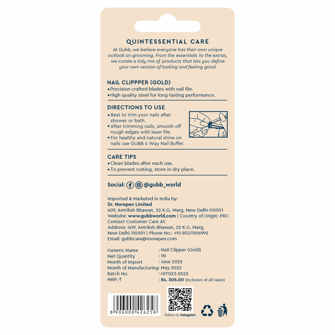 GUBB brings to you a luxe nail clipper in a jaw-dropping colour, gold . A glamorous addition to your manicure kit, this clipper is made from high quality, rust resistant carbon steel. The sharp, curved blades hug your nails for precise, safe application.