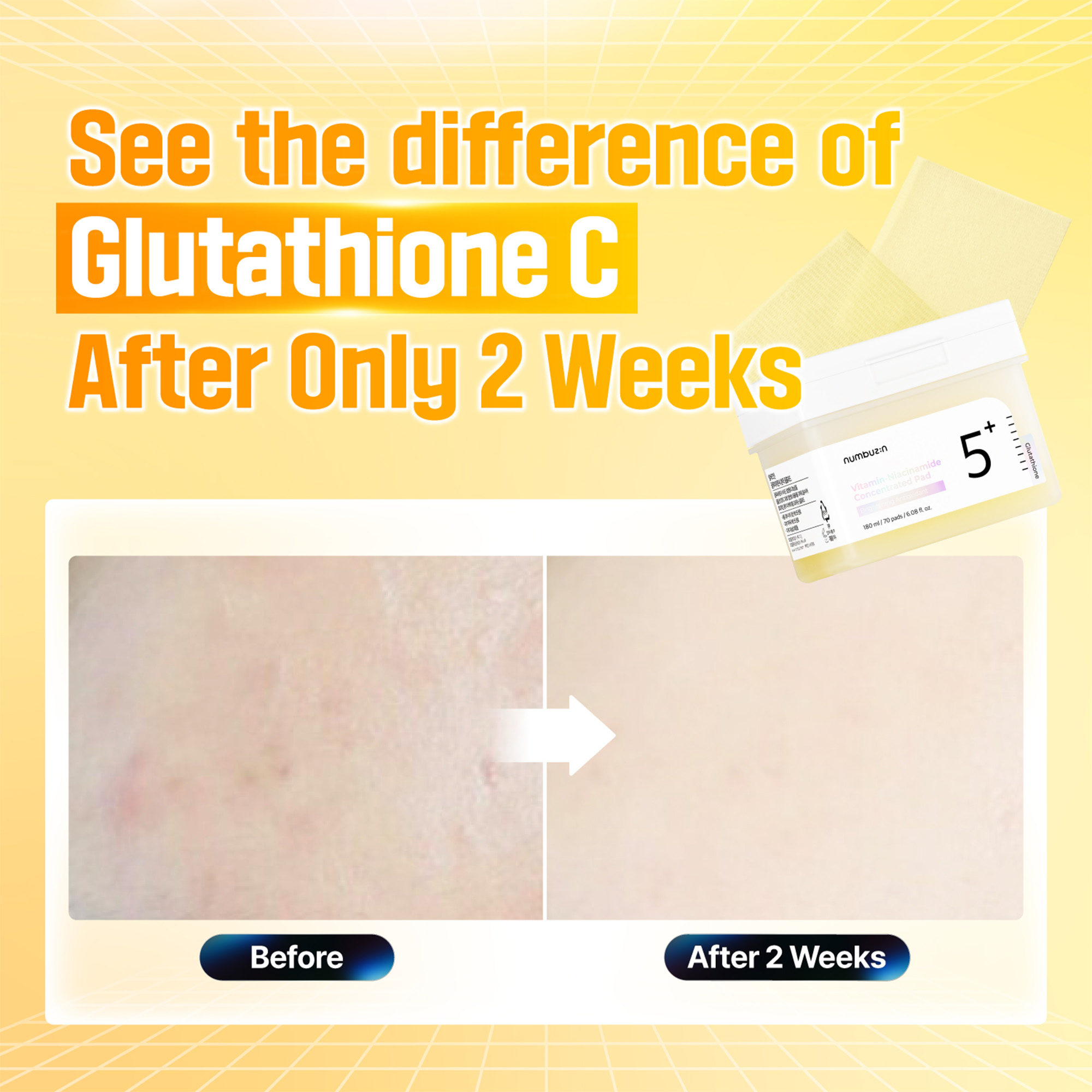 Get a brighter complexion in just 2 weeks with the No.5 Vitamin-Glutathione Concentrated Toner Pad! Formulated with 5% glutathione, vitamin C and tranexamic acid that target hyperpigmentation, post-breakout marks and sun spots. It also contains PHA and LHA for gentle exfoliation. These are double sided pads for a double effect: The glutathione smooth jelly side for brightening skin complexion and the cotton gauze side for gently resurfacing skin texture.