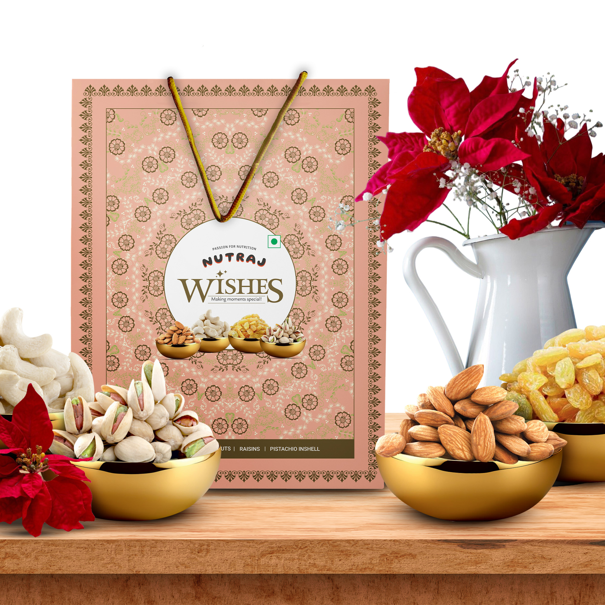 This Diwali, elevate your festive gifting with the Nutraj Wishes Royal Blossom Dry Fruits Gift Boxa luxurious assortment of premium dry fruits, beautifully packed to reflect tradition, elegance, and good health.Whats Inside? Almond Kernels 125g Cashew Nuts 125g Indian Raisins 125g Roasted & Salted Pistachios (Inshell) 125g Crafted with care and packed in individual mono cartons, this 500g gift box brings together the finest dry fruits to offer a perfect balance of taste and nutrition. Each nut is selected for its superior quality, crunch, and freshnessmaking it an ideal festive gift for your loved ones, clients, or colleagues. Whether you're celebrating Diwali with family or sending warm wishes from afar, the Royal Blossom Gift Box is a symbol of love, prosperity, and wellness. Why Choose Nutraj Wishes Royal Blossom? Premium festive packaging, perfect for gifting Rich in taste, quality, and health benefits A thoughtful way to say Happy Diwali Make your celebrations truly royalgift health, taste, and tradition with Nutraj.