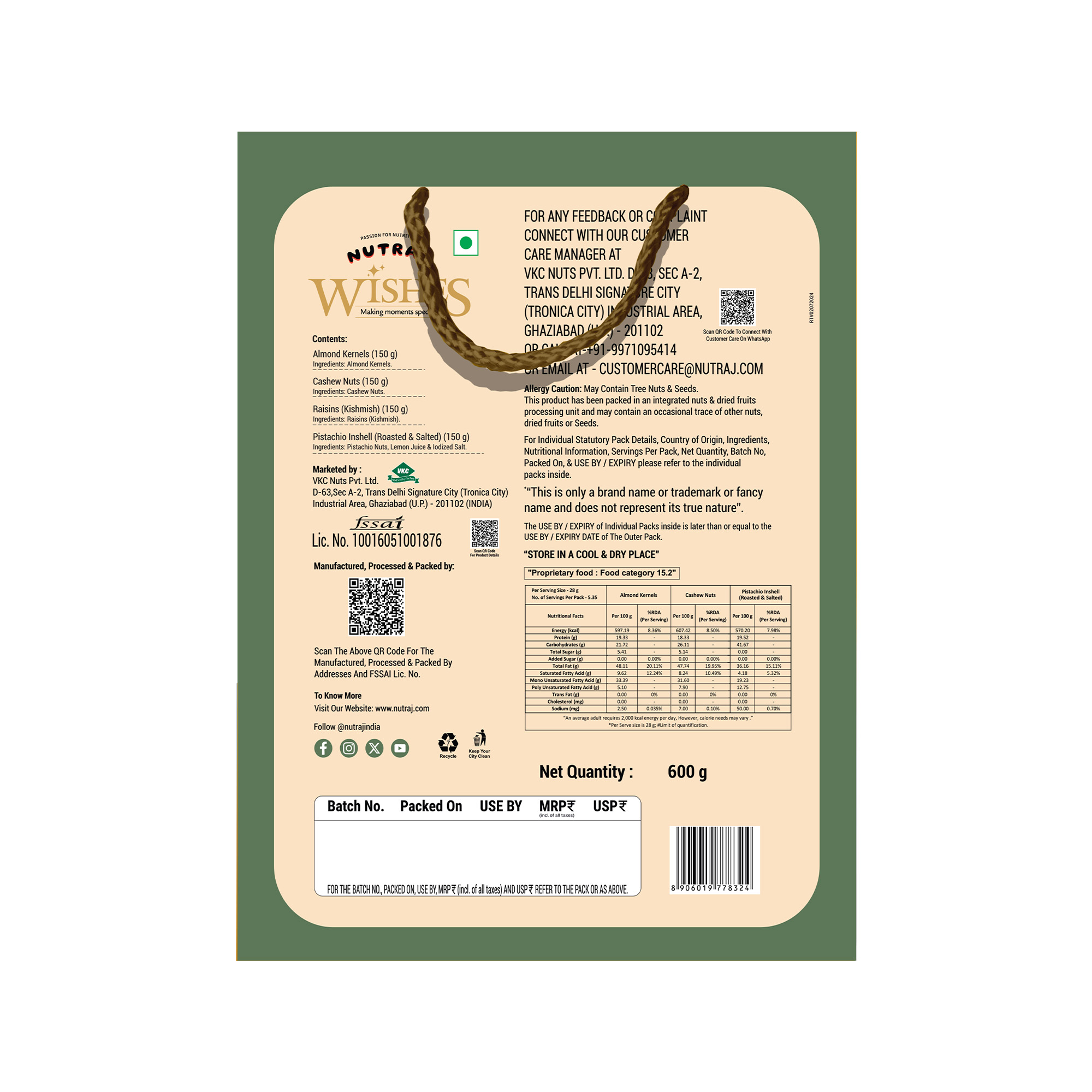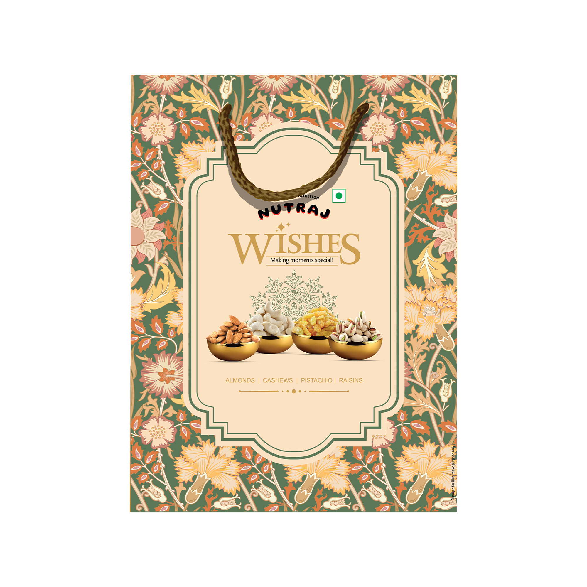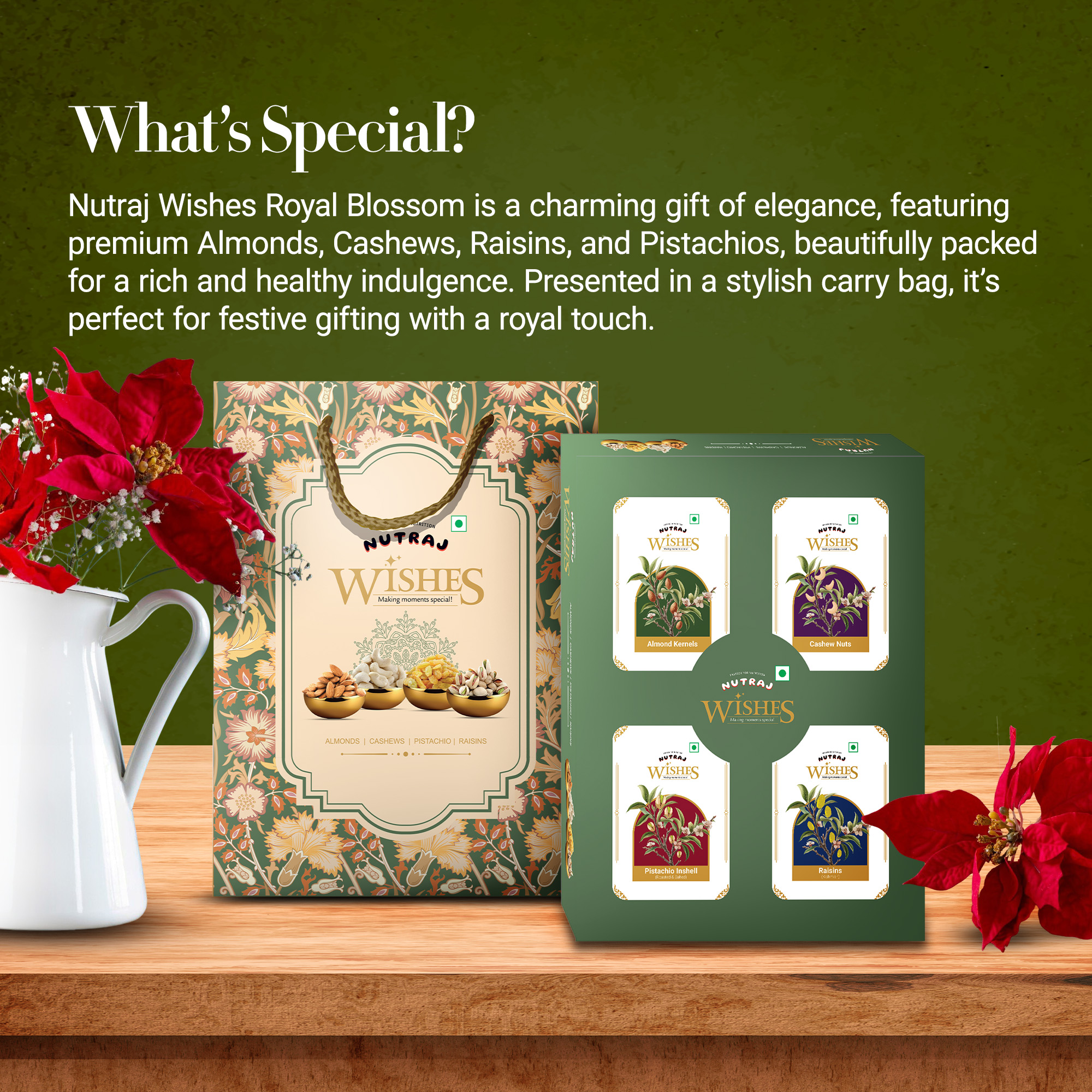 Experience the epitome of luxury, thoughtfulness, and love with Nutraj Wishes Royal Blossom Diwali Gift Box. This exquisite box is made to make your Diwali gifting unforgettable, conveying your deepest sentiments and care for your loved ones. What's Inside? Almonds 150g Cashews 150g Raisins 150g Pistachio Inshell 150g Wrap your loved ones in love and care this Diwali with our stunning 'Royal Blosoom' Dry Fruit Gift Box. The elegant floral design and luxurious slider packaging will make them feel special, while the wholesome dry fruits will nourish their body and soul. As you share this exquisite gift, you're not just exchanging presents - you're sharing a piece of your heart and the joy of the festival. As you share this thoughtful gift with your loved ones, remember to capture with Nutraj and treasure the memories forever. Wishing you and your dear ones a Diwali that's as radiant and beautiful as your relationships!