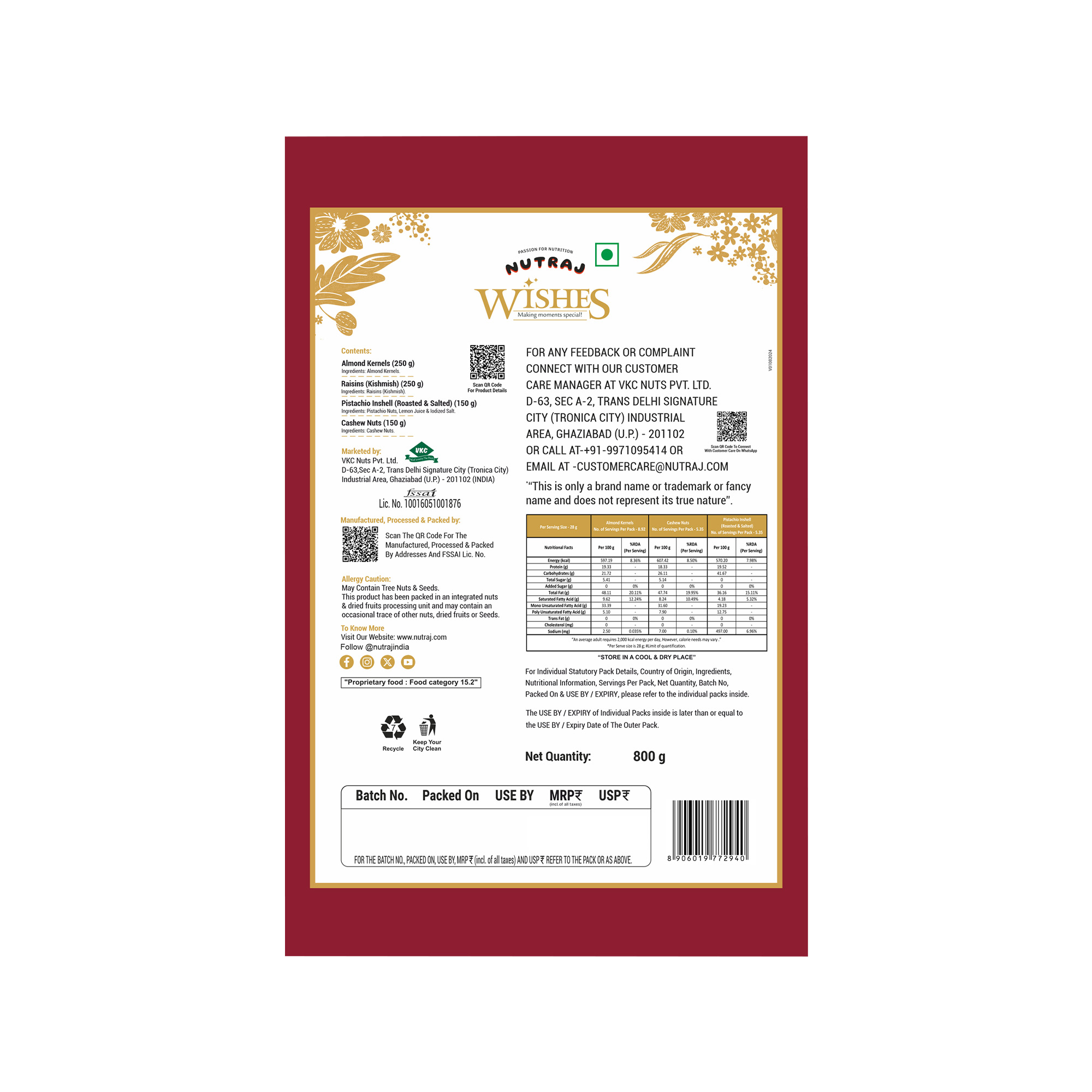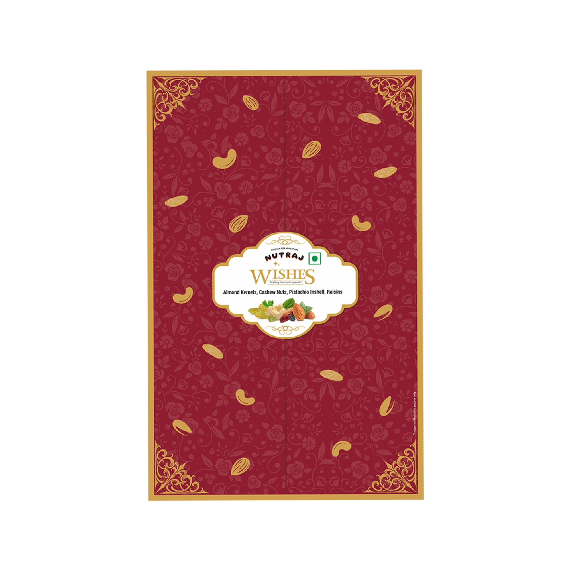 This Diwali, gift the ultimate treasure - good health! Nutraj Wishes Royal Majesty Diwali Gift Box presents a majestic collection of premium nuts, carefully selected for their exceptional taste and nutritional value, beautifully packaged in a stunning design. What's Inside? Nutraj Wishes Almond Kernels 250g Nutraj Wishes Cashew Nuts 150g Nutraj Wishes Raisins 250g Nutraj Wishes Pistachio Inshell (R&S) 150g Delight your loved ones with the Nutraj Dry Fruit Gift Box, featuring a stunning double-door design that reveals a thoughtfully curated selection of premium nuts and dry fruits. This exquisite gift box promises to elevate snacking experiences and create cherished moments. Share the joy of Diwali with a gift that's truly special and captures moments in a nutshell. Wishing you and your family a happy, love-filled Diwali!
