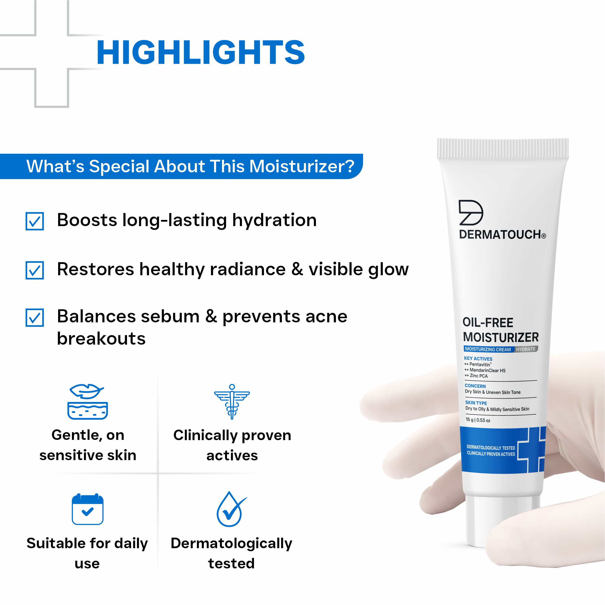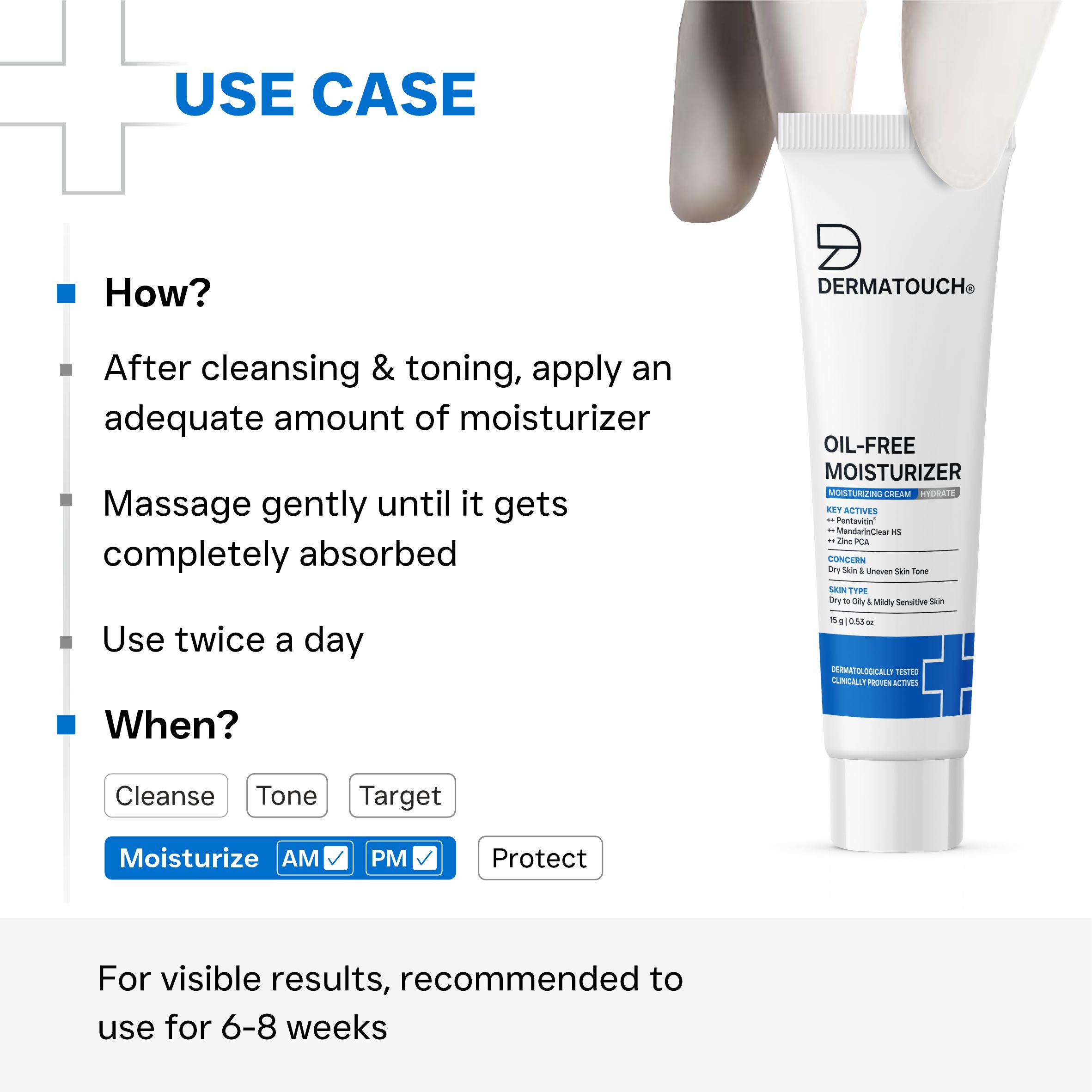 Dermatouch Oil-Free Moisturizer is a Lightweight Daily Moisturiser Formulated to Deliver Effective Hydration without Adding Excess Oil. Its Fast-Absorbing, Non-Greasy Texture Helps Maintain Skin Comfort while Keeping the Skin Feeling Fresh, Light and Balanced Throughout the Day. Designed Especially for Oily and Combination Skin Types, the Oil-Free Formulation Helps Hydrate the Skin Without Clogging Pores or Causing Heaviness. With Regular Use, it Supports Smooth, Comfortable-Feeling Skin and Helps Control Excess Shine, Making it Suitable for Everyday Skincare Routines and For Layering Under Sunscreen or Makeup.