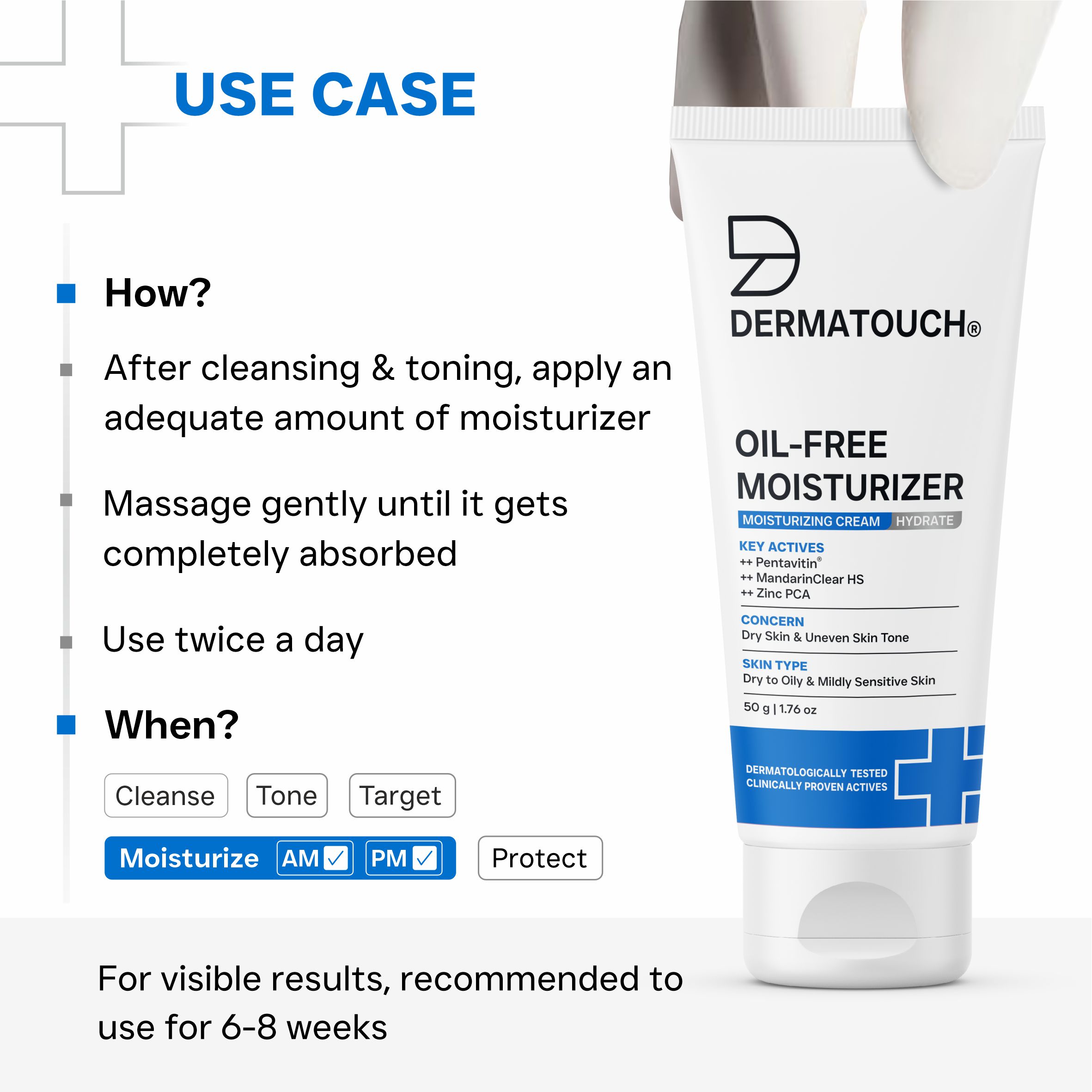 Dermatouch Oil-Free Moisturizer is a Lightweight Daily Moisturiser Formulated to Deliver Effective Hydration without Adding Excess Oil. Its Fast-Absorbing, Non-Greasy Texture Helps Maintain Skin Comfort while Keeping the Skin Feeling Fresh, Light and Balanced Throughout the Day. Designed Especially for Oily and Combination Skin Types, the Oil-Free Formulation Helps Hydrate the Skin Without Clogging Pores or Causing Heaviness. With Regular Use, it Supports Smooth, Comfortable-Feeling Skin and Helps Control Excess Shine, Making it Suitable for Everyday Skincare Routines and For Layering Under Sunscreen or Makeup.
